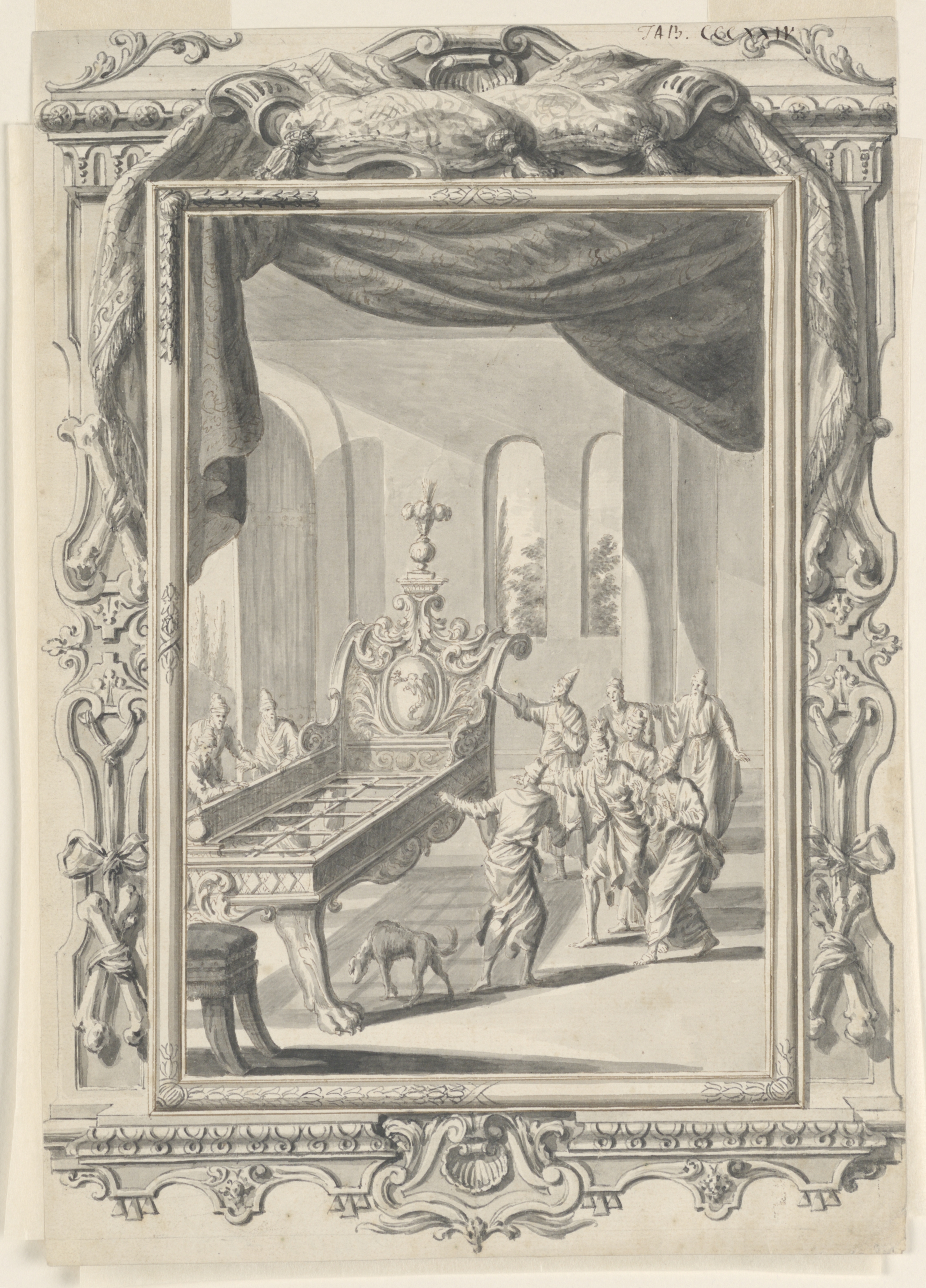 Drawing, Study for The Iron Bedstead of King Og, Plate 324, Physica Sacra; Johann Melchior Füssli (Swiss, 1677–1736); Written by Johann Jakob Scheuchzer (Swiss, 1672–1733); Published by Christian Ulrich Wagner; Switzerland; brush and grey, black wash, pen and brown, black ink on cream laid paper; 29.0 × 20.3 cm (11 7/16 × 8 in.); Museum purchase from the Mary Hearn Greims Fund; 1940-110-7