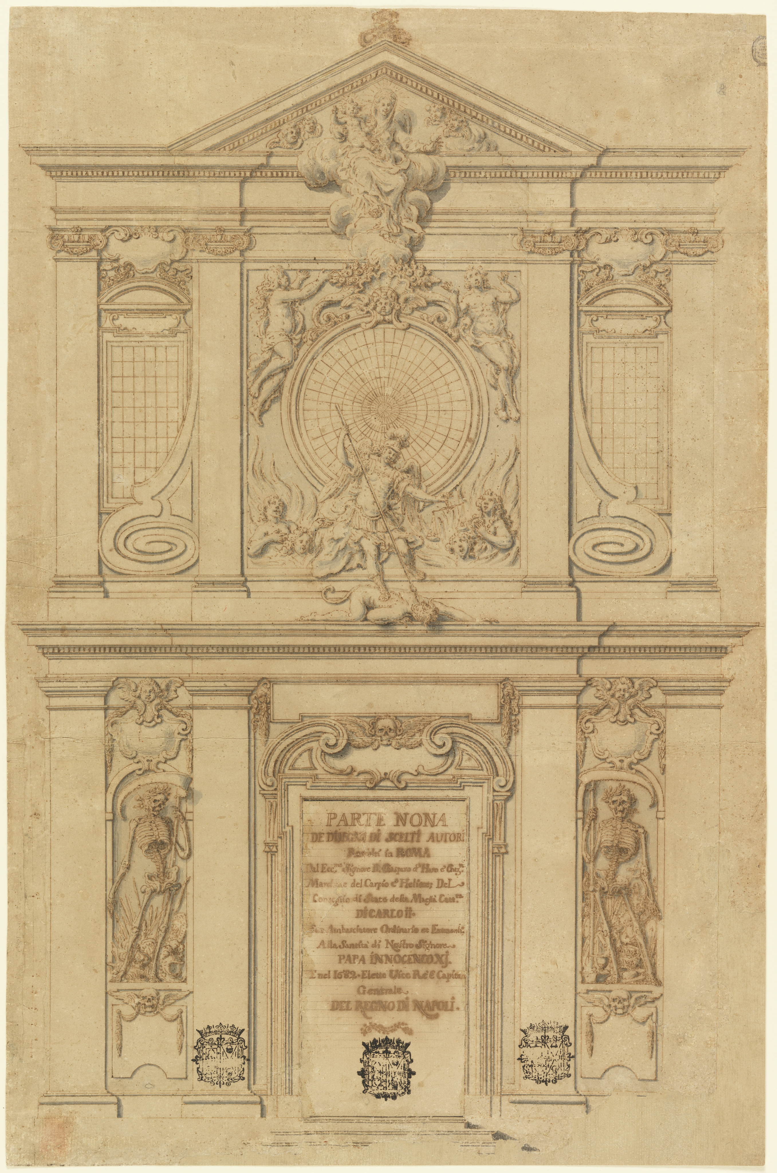 The door has been cut out and replaced by a piece of paper with the inscription: PARTE NONA / DE DISEGNI DI SCELTI AUTORI / Raccolti in ROMA / Dal Ecc. mo Signore D. Gasparo d'Haro e Guz. n Marchese del Carpio e Heliore. Del / Conseglio di Stato della Maestà Catt. ea / DI CARLO II. / Suo Ambasciatore Ordinario et Extraord. io / Alla Santità di Nostro Signore / PAPA INNOCENCO XI. / E nel 1682. Eletto Vice Rè e Capitano / Gererale / DEL REGNO DI NAPOLI
