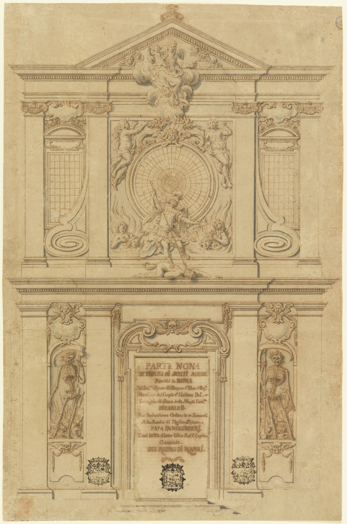 Drawing, Title Page, Part 9, from an Album of Drawings belonging to Don Gaspero Méndez de Haro y Guzman; Unknown; Patron: Gasparo Mendez de Haro y Guzman (Spanish); pen and brown ink, brush and blue-gray and brown wash, black chalk on heavy brown laid paper, lined; 64.3 × 42.2 cm (25 5/16 × 16 5/8 in.); Museum purchase from the Mary Hearn Greims Fund; 1940-21-43