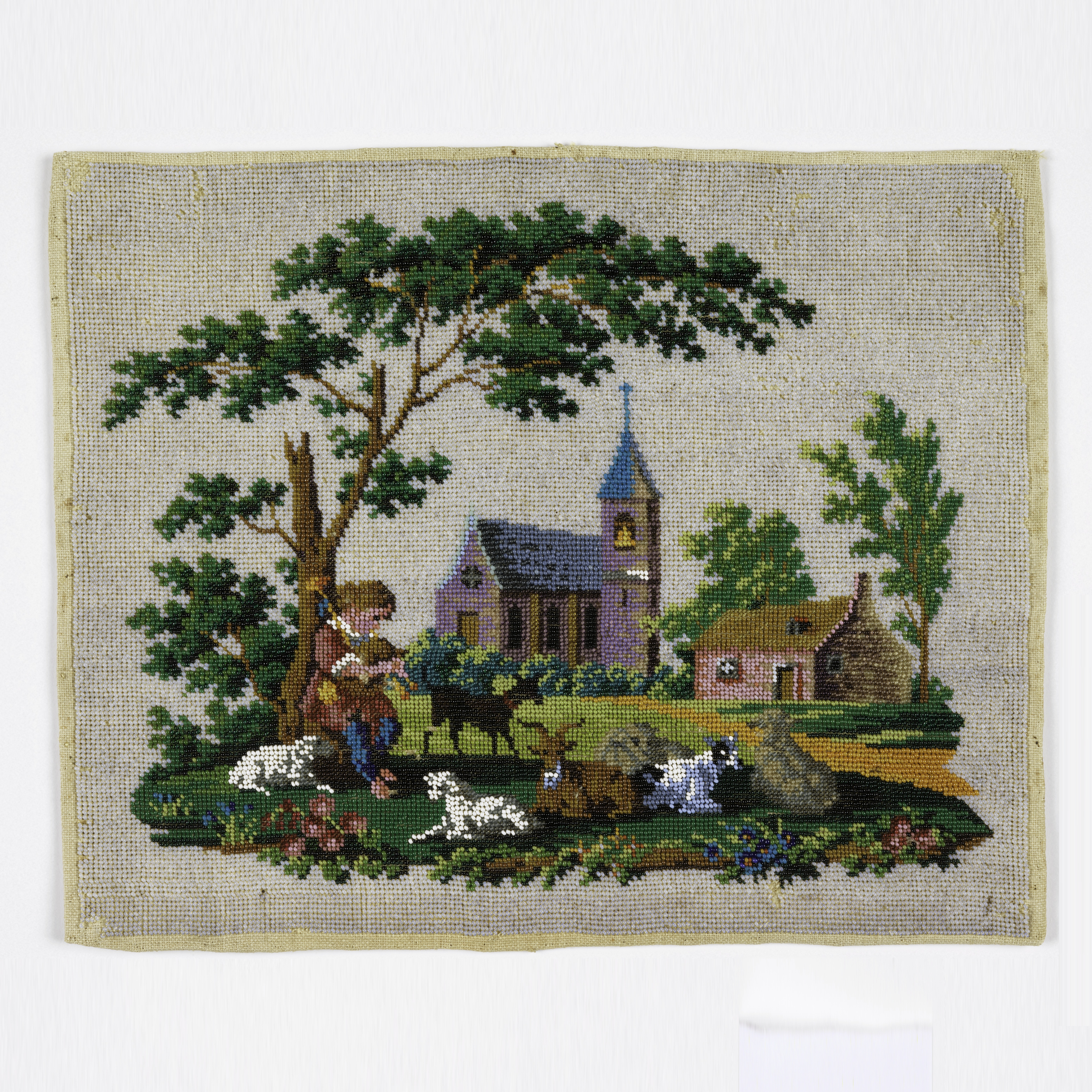 This is a Beaded picture. It is dated 19th century and we acquired it in 1940. Its medium is linen, glass beads and its technique is embroidered with beads. It is a part of the Textiles department.