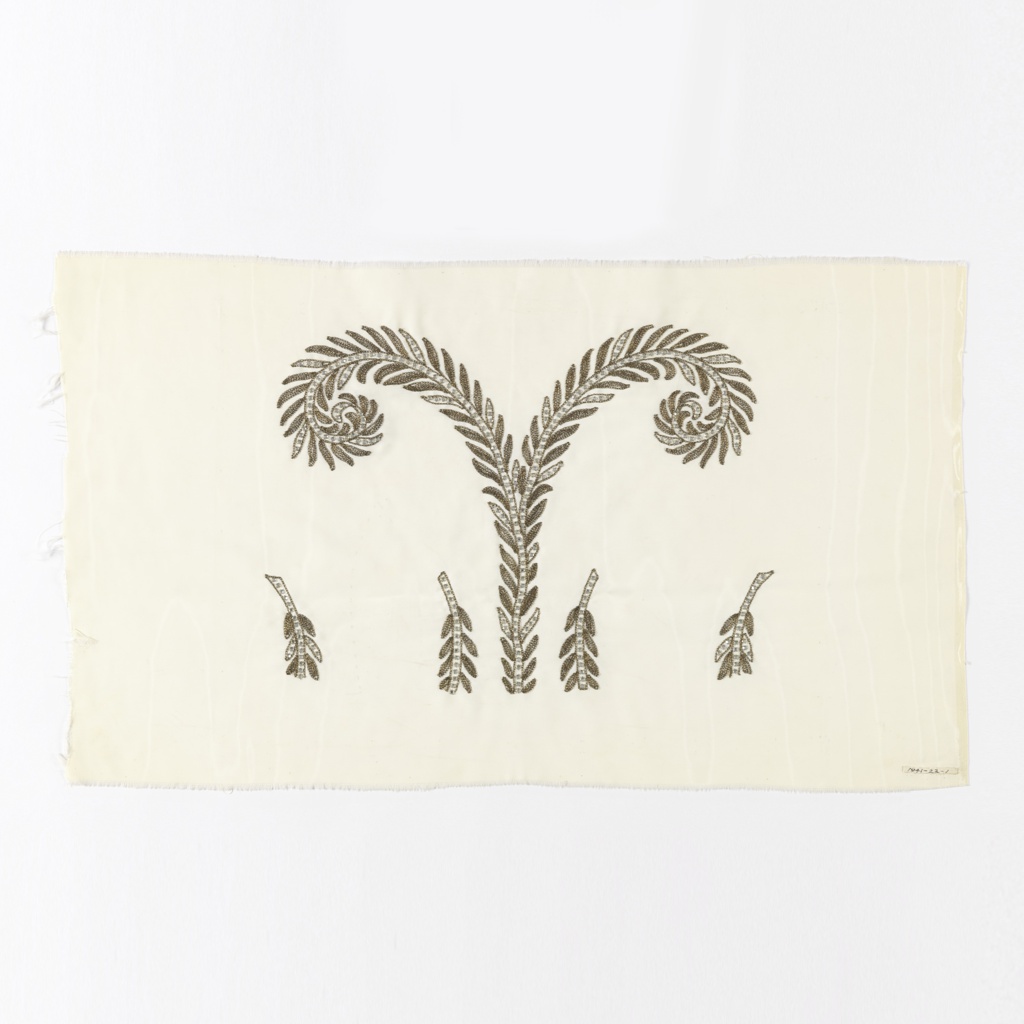Couture Embroidery Sample (USA); Made by Caltabiano Embroideries, Inc. (New York, NY, USA); silk, rhinestones, gold thread; H x W: 39 x 66 cm (15 3/8 x 26 in.); Gift by Caltabiano Embroideries; 1941-22-1