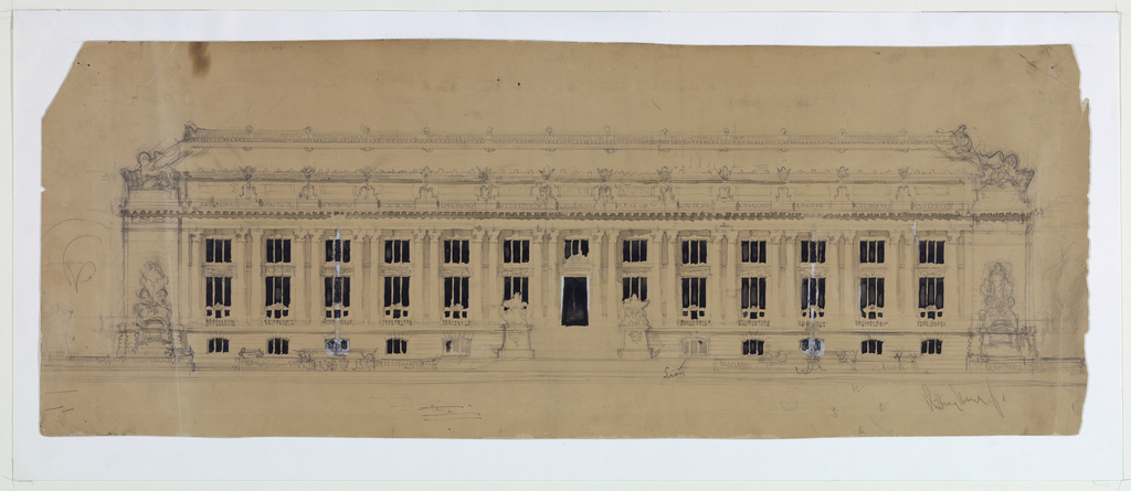 Drawing, Study for the Fifth Avenue Elevation of the New York Public Library; Designed by Whitney Warren Jr. (American, 1864–1943); USA; graphite, brush and ink, pen and ink on tan paper; 62.7 x 23.6 cm (24 11/16 x 9 5/16 in.); Gift of Mrs. William Greenough; 1941-49-1