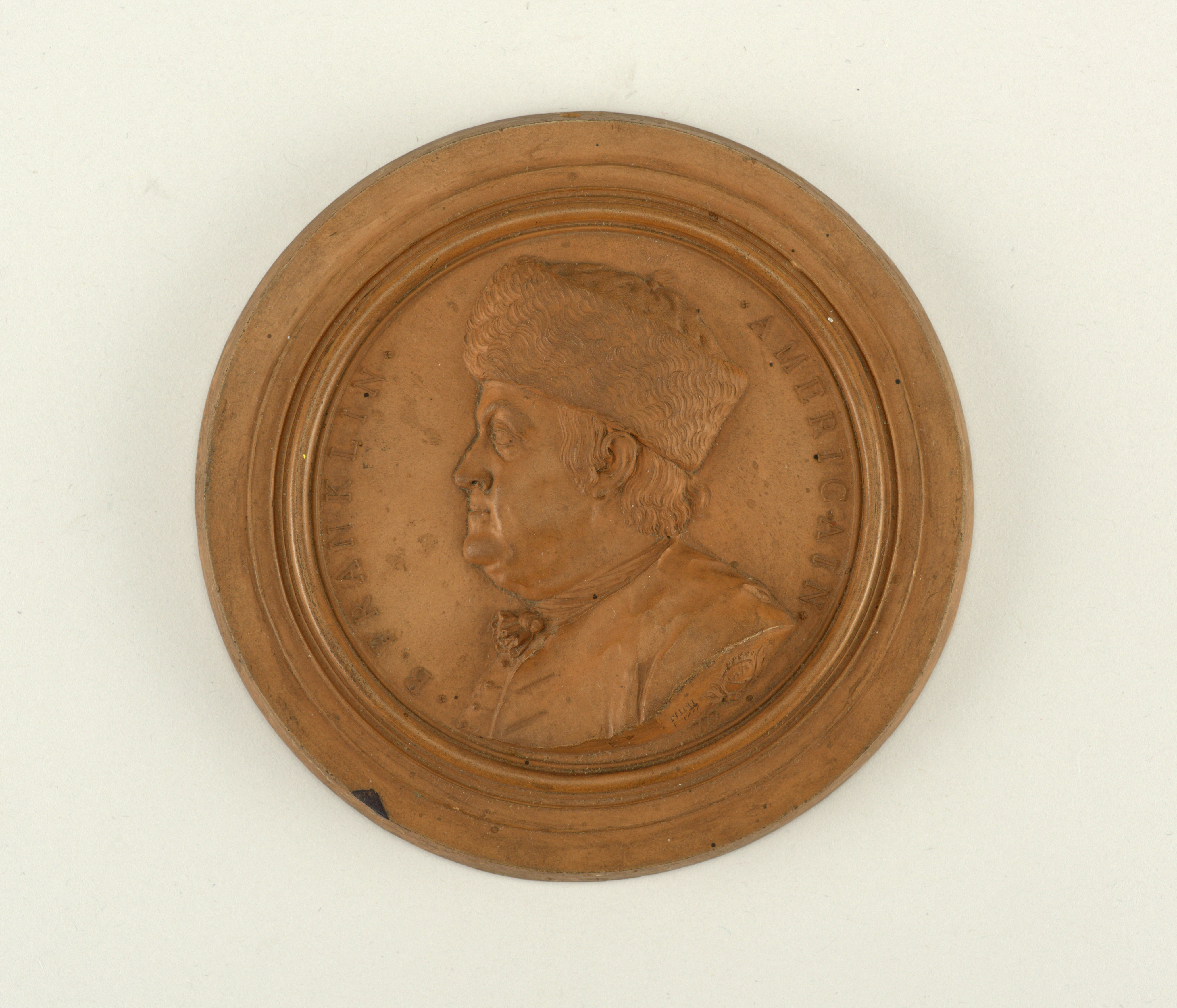 This is a Medallion. It was designed by Jean-Baptiste Nini and subject: Benjamin Franklin. It is dated 1777 and we acquired it in 1941. Its medium is molded terracotta. It is a part of the Product Design and Decorative Arts department.