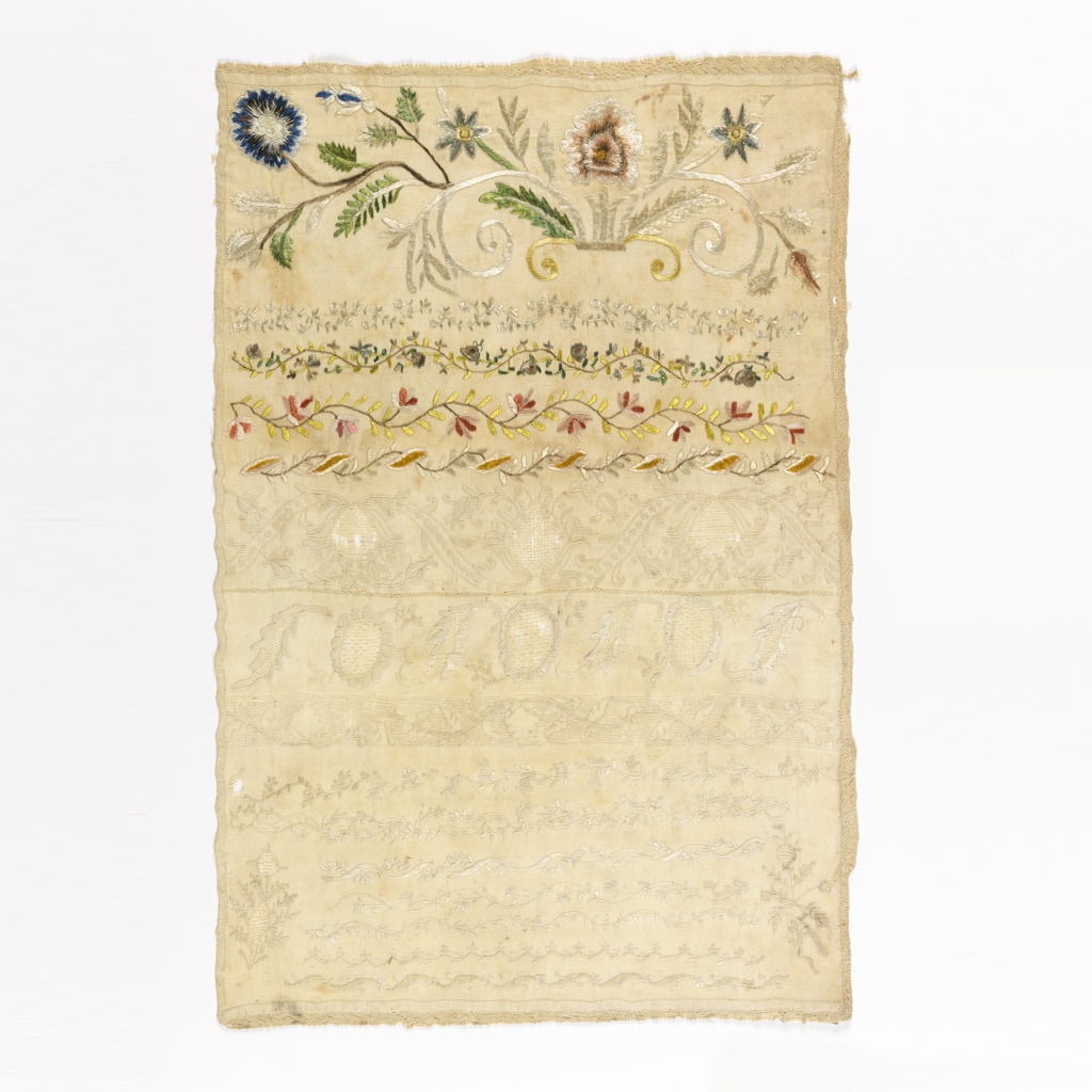 This is a Sampler. It is dated 18th century and we acquired it in 1941. Its medium is silk and linen embroidery, linen foundation and its technique is satin, stem and split stitches with drawnwork on plain weave. It is a part of the Textiles department.