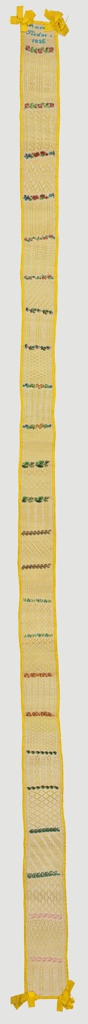 Sampler (Germany); Made by Maria Flodor; cotton, glass beads, paper backing; 216 x 9.5 cm (85 1/16 x 3 3/4 in.); Bequest of Mrs. Henry E. Coe; 1941-69-159