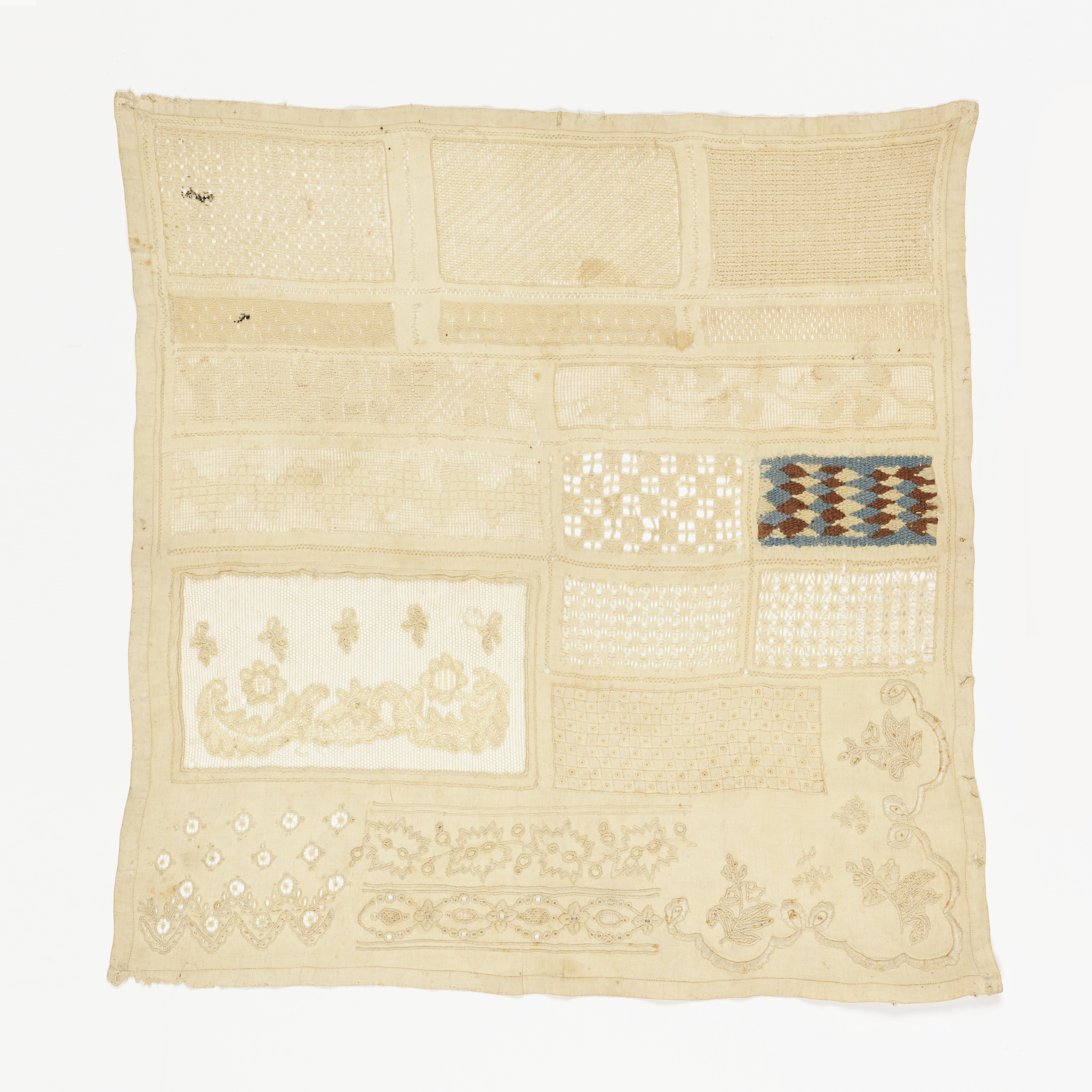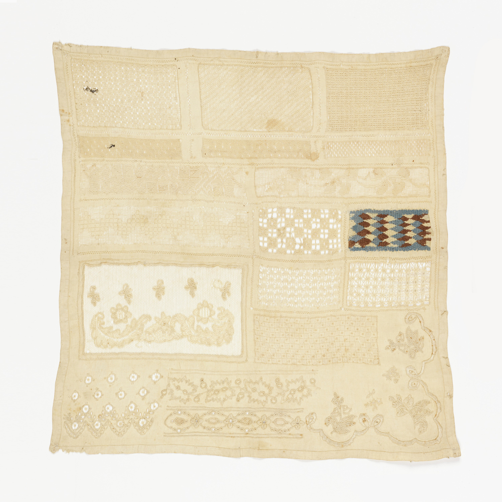 This is a Sampler. It is dated 19th century and we acquired it in 1941. Its medium is cotton and wool embroidery, linen foundation and its technique is buttonhole, overcasting, darning and drawnwork stitches on plain weave. It is a part of the Textiles department.