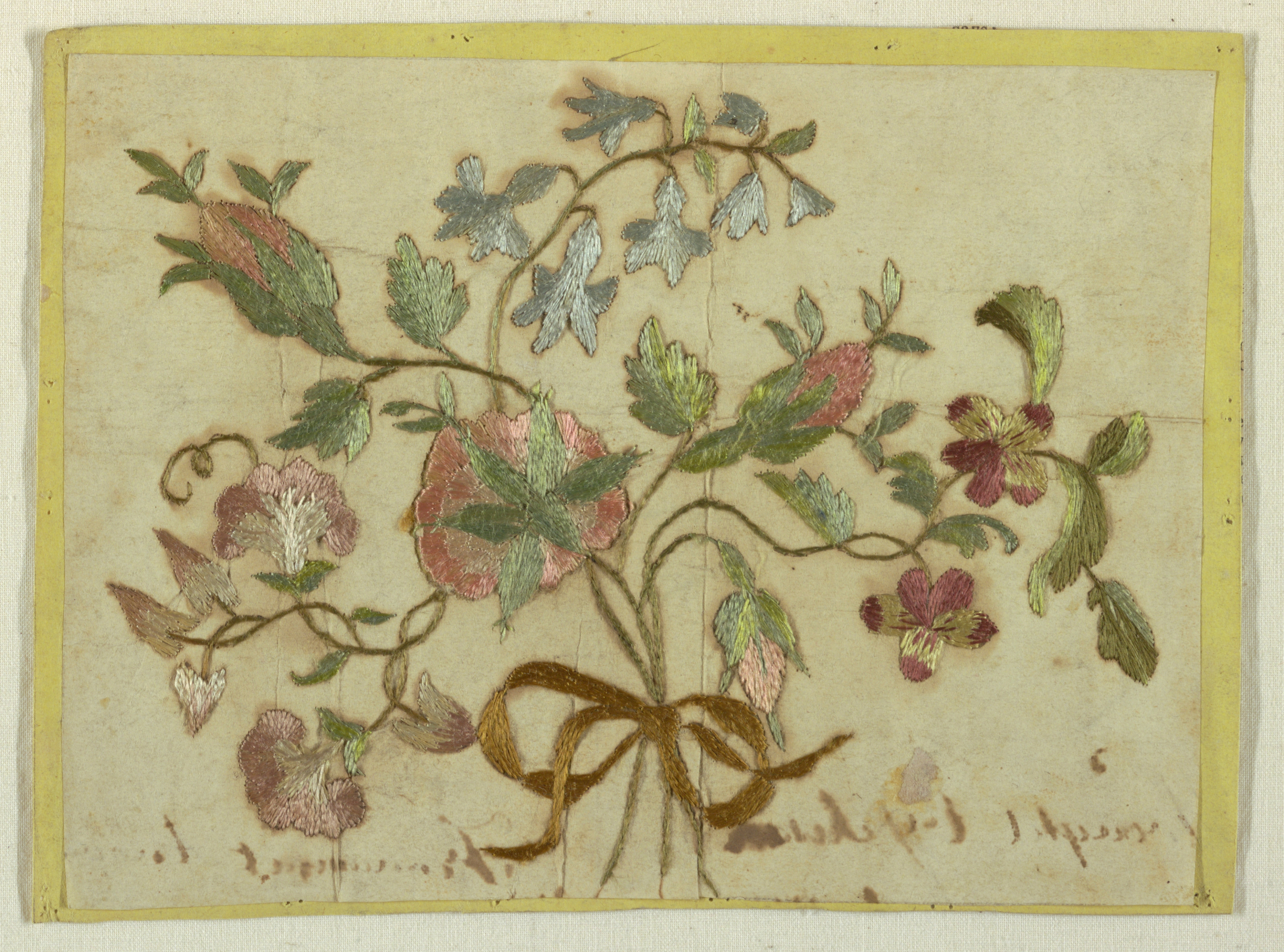 This is a Embroidered picture. It is dated late 19th century and we acquired it in 1941. Its medium is silk on paper and its technique is satin stitch. It is a part of the Textiles department.