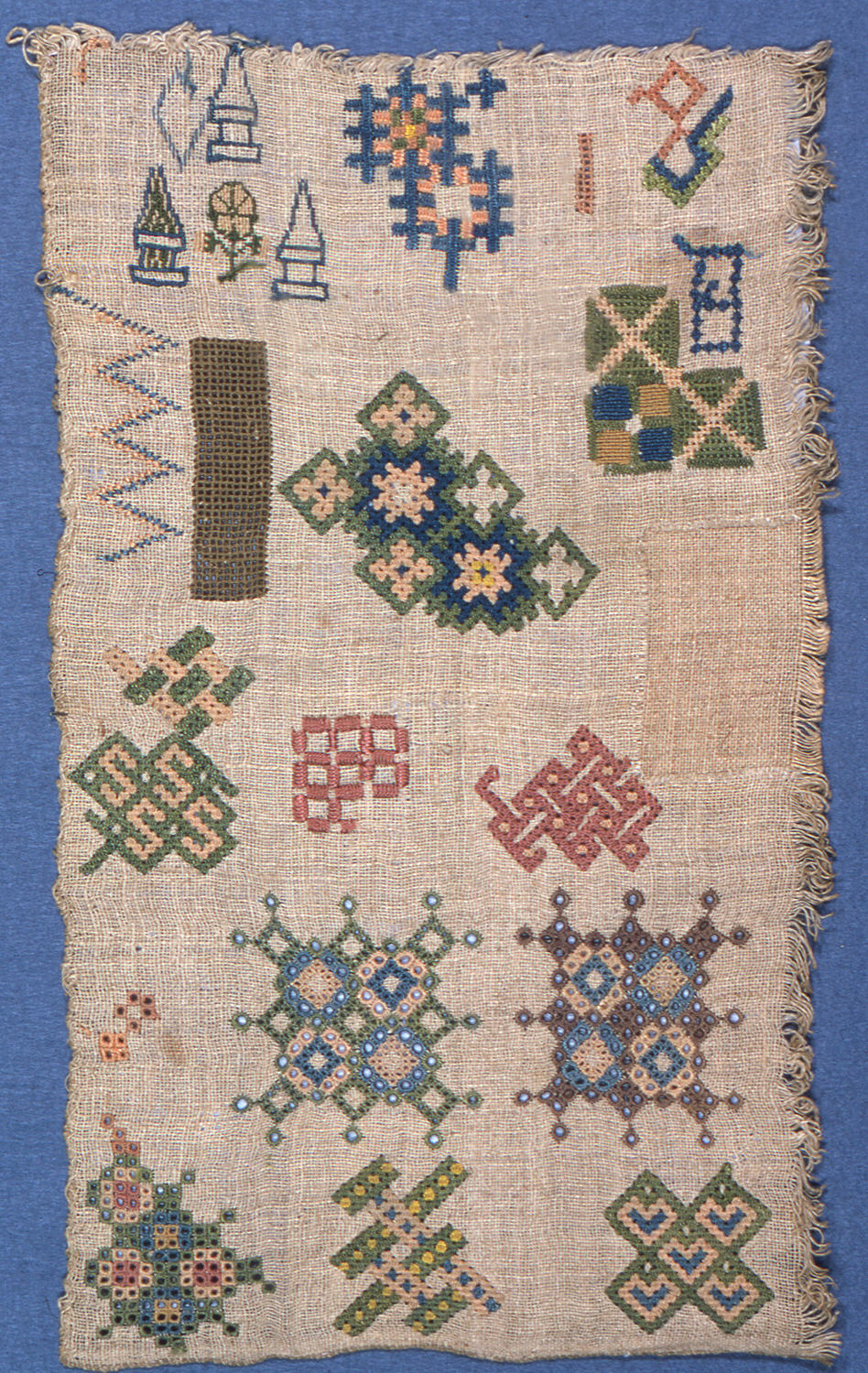 This is a Sampler. It is dated early 17th century and we acquired it in 1941. Its medium is silk embroidery, linen foundation and its technique is wrapped bars, eyelet, tent, rococo, and satin stitches on plain weave. It is a part of the Textiles department.