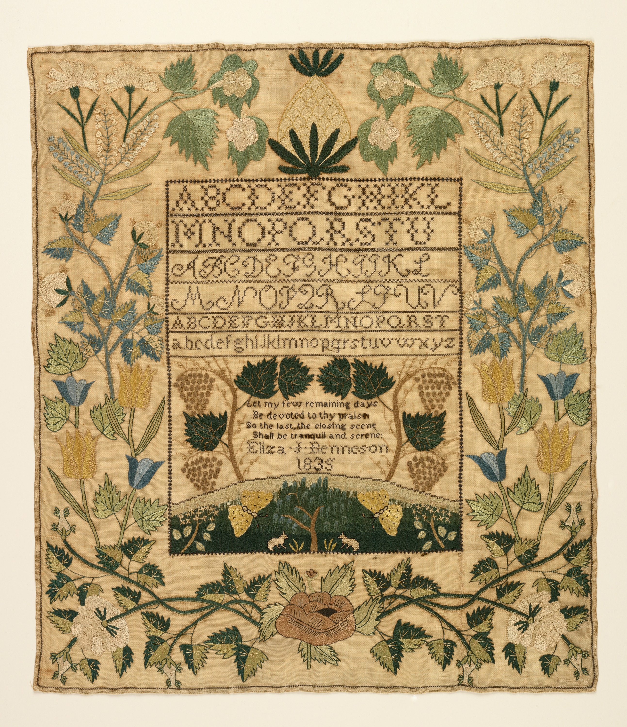 This is a Sampler. It was embroidered by Eliza J. Benneson. It is dated possibly 1825 and we acquired it in 1941. Its medium is silk embroidery on cotton foundation and its technique is embroidered in cross, stem, eyelet, rococo, running, and satin stitches on plain weave foundation. It is a part of the Textiles department.