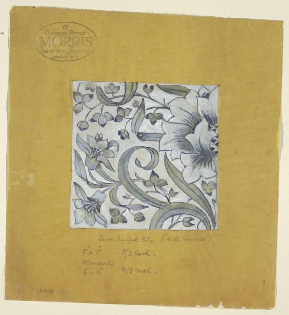 Inscribed in graphite, lower center, underneath design: Two-handed tile (left hand side) / 5" × 5" — 3/3 each. / Also made / 6" x 6" 4/3 each.; lower left corner: 3/3