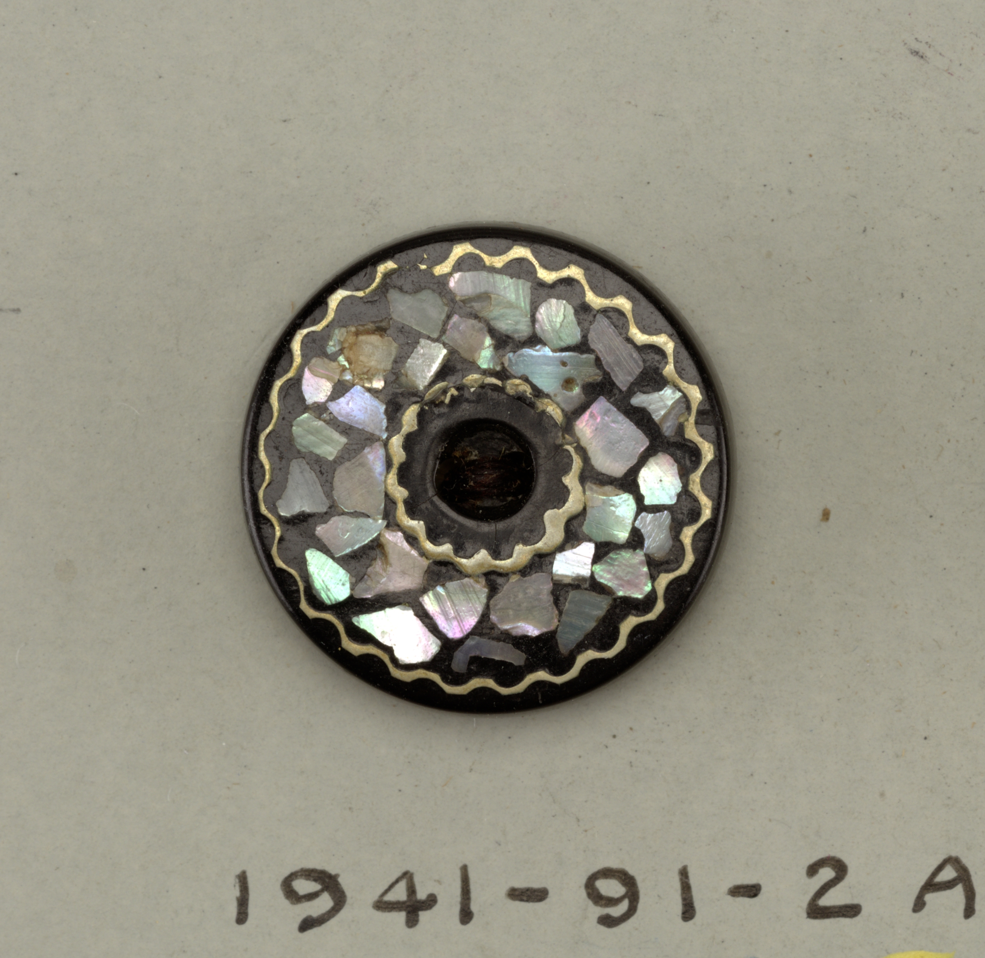 This is a buttons. It is dated ca. 1880 and we acquired it in 1941. Its medium is rubber; mother of pearl, brass in tin. It is a part of the Product Design and Decorative Arts department.