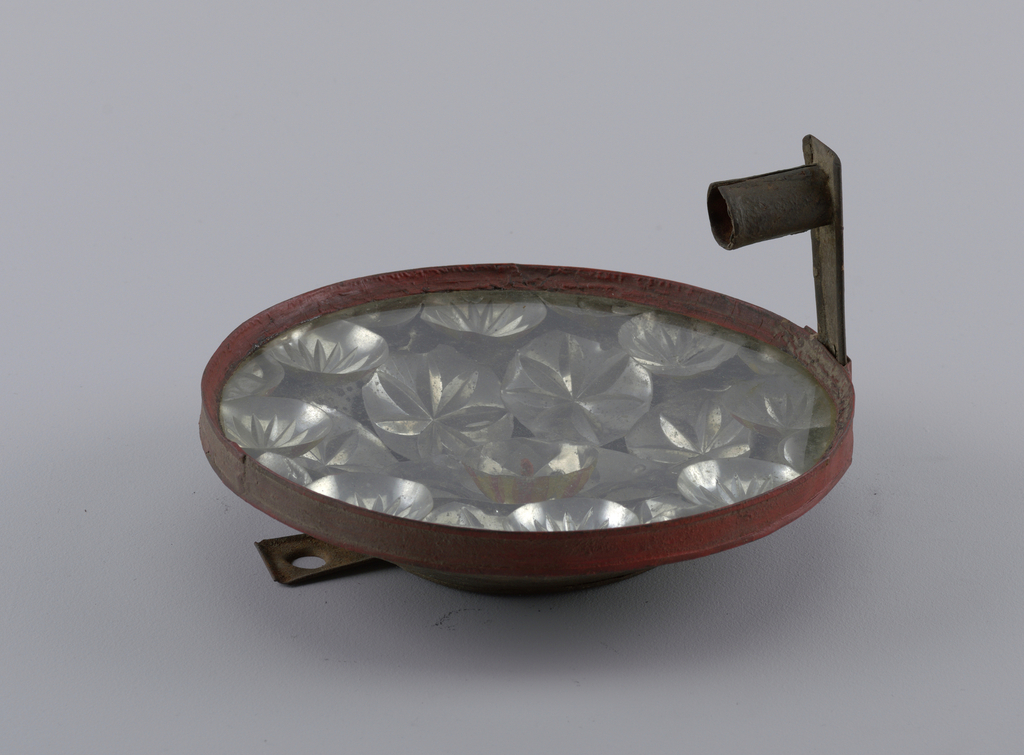 This is a socket. It is dated early 19th century and we acquired it in 1941. Its medium is tin, painted in places, glass, pewter. It is a part of the Product Design and Decorative Arts department.