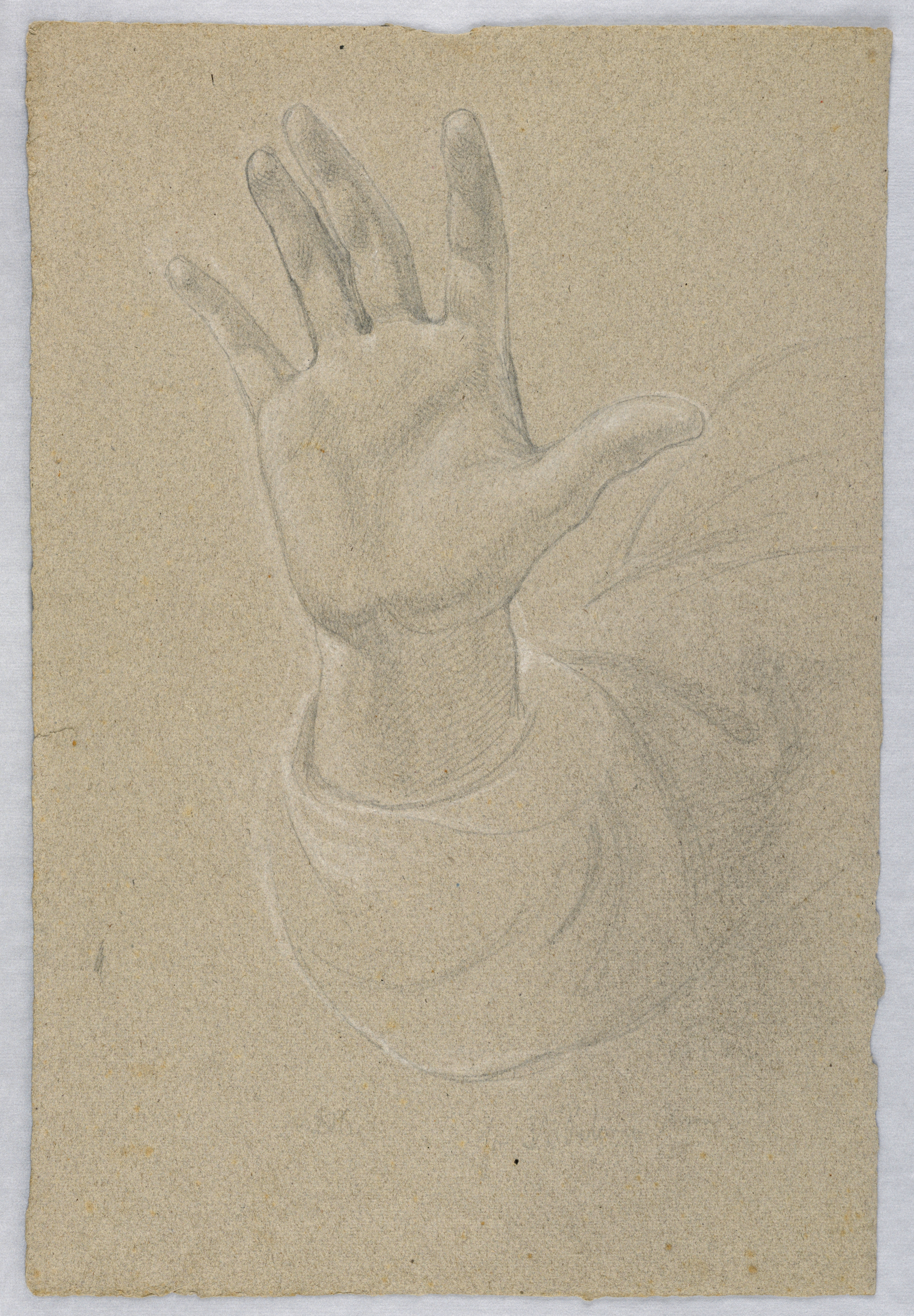Drawing, Study of Hand for "Early Christian Martyrs"; Daniel Huntington (American, 1816–1906); Italy; graphite and white chalk on gray-brown paper; 44.1 x 30 cm (17 3/8 x 11 13/16 in.); Bequest of Erskine Hewitt; 1942-50-72