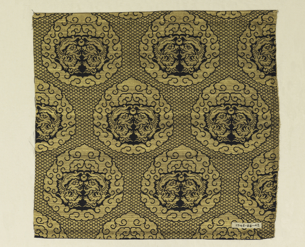 This is a Textile. It is dated 19th century and we acquired it in 1942. Its medium is silk, paper with applied gold foil and its technique is plain compound twill. It is a part of the Textiles department.