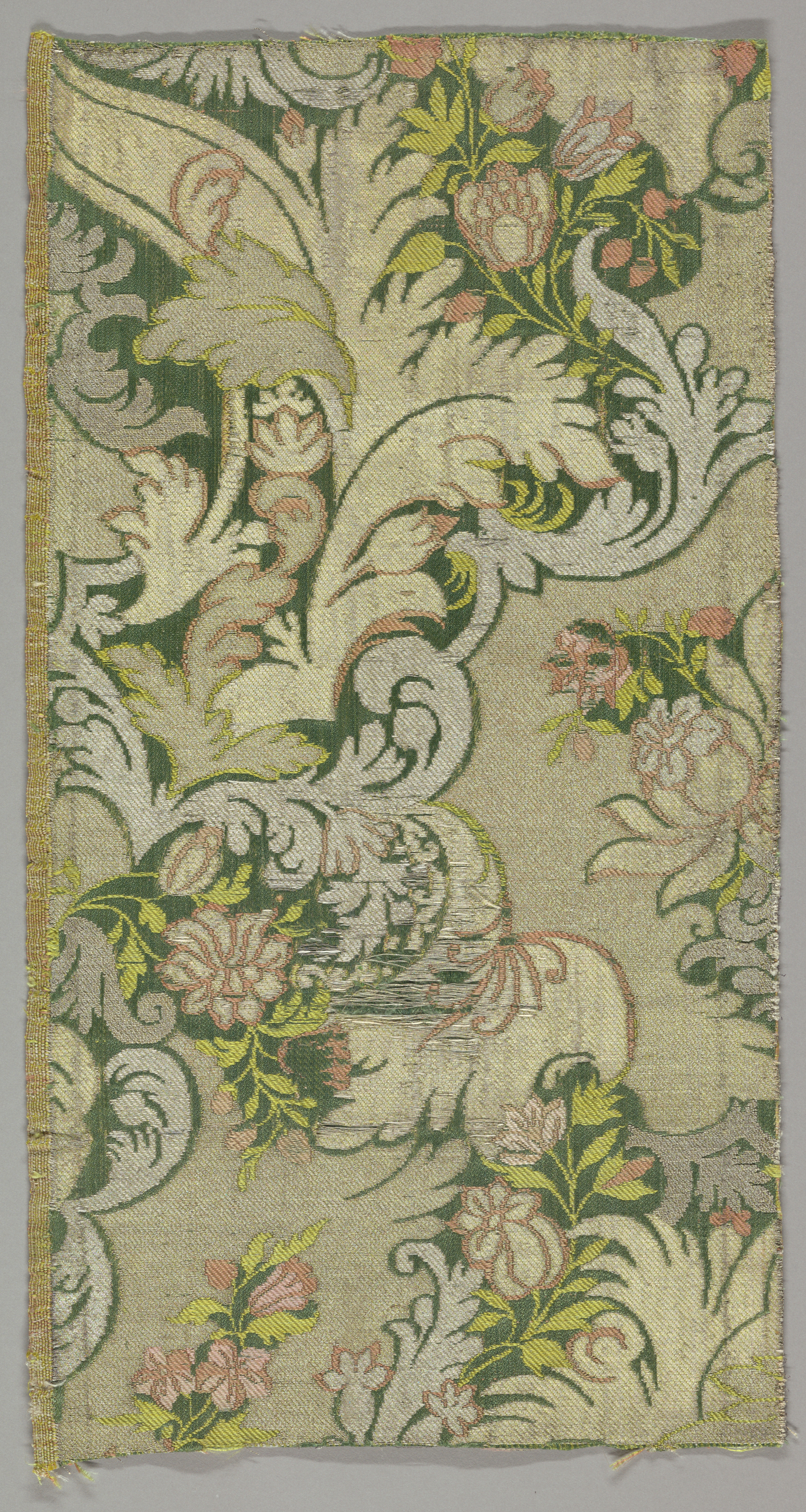 This is a Fragment. It is dated early 18th century and we acquired it in 1943. Its medium is silk, metallic yarns and its technique is satin weave with supplementary weft patterning (brocade). It is a part of the Textiles department.