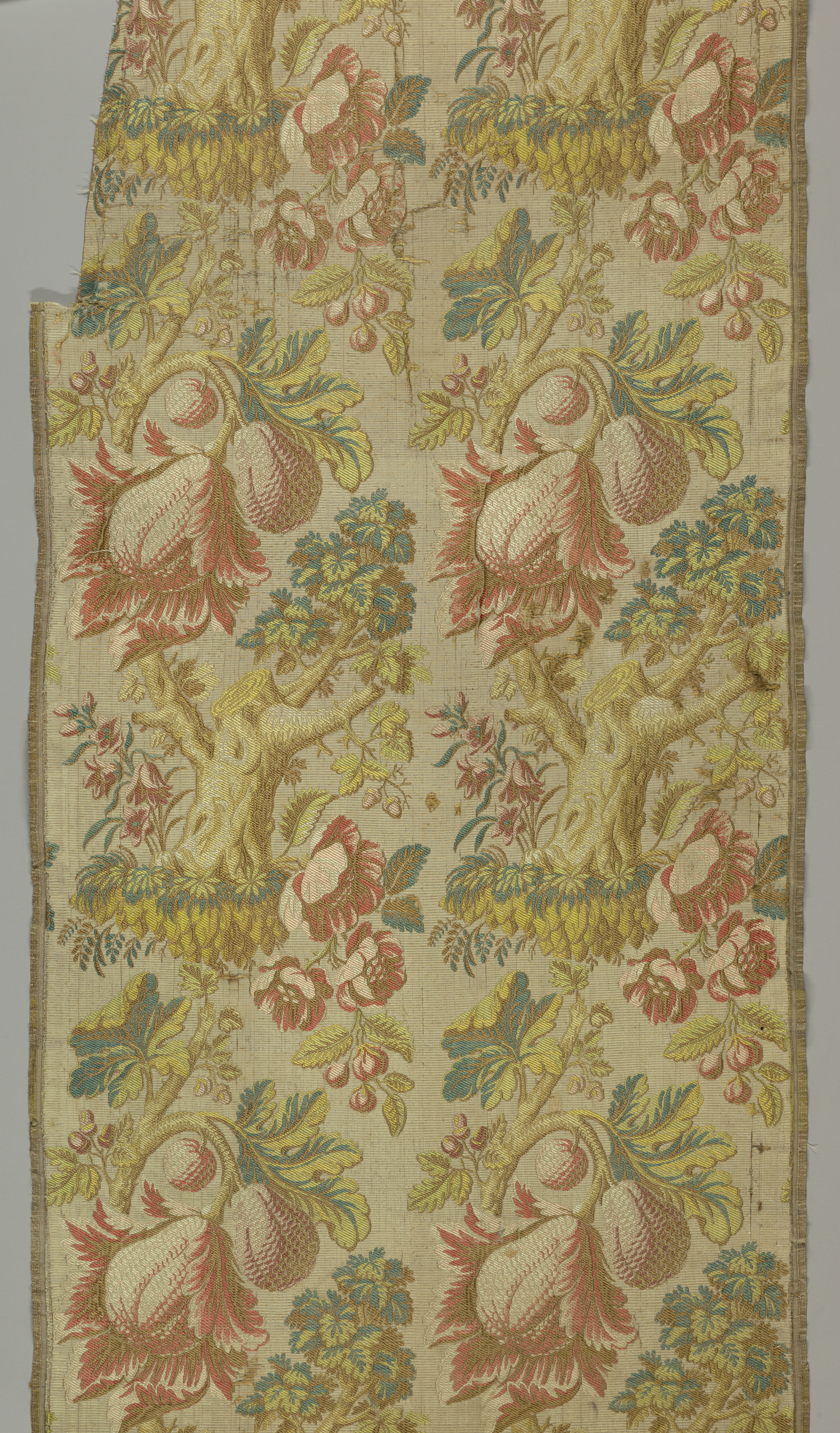 This is a Fragments. It is dated ca. 1730 and we acquired it in 1943. Its medium is silk and its technique is plain weave with discontinuous supplementary weft patterning (brocade). It is a part of the Textiles department.