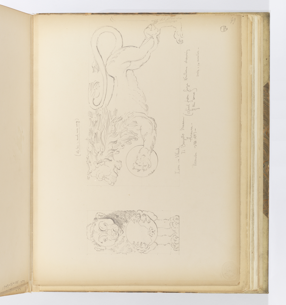 Recto, in graphite, upper right corner (perpendicular to drawing: (inscribed in circle) 86 / 99. Above drawing of lion seen in profile: (the hair is much more wavy). Below drawing of lion seen in profile: Lion in Wood / Il Bargello Museum - / Florence - (copied from George Newtons [sic] drawing/ of the same) / November 13th 1887 / scale = 1/10 execution.