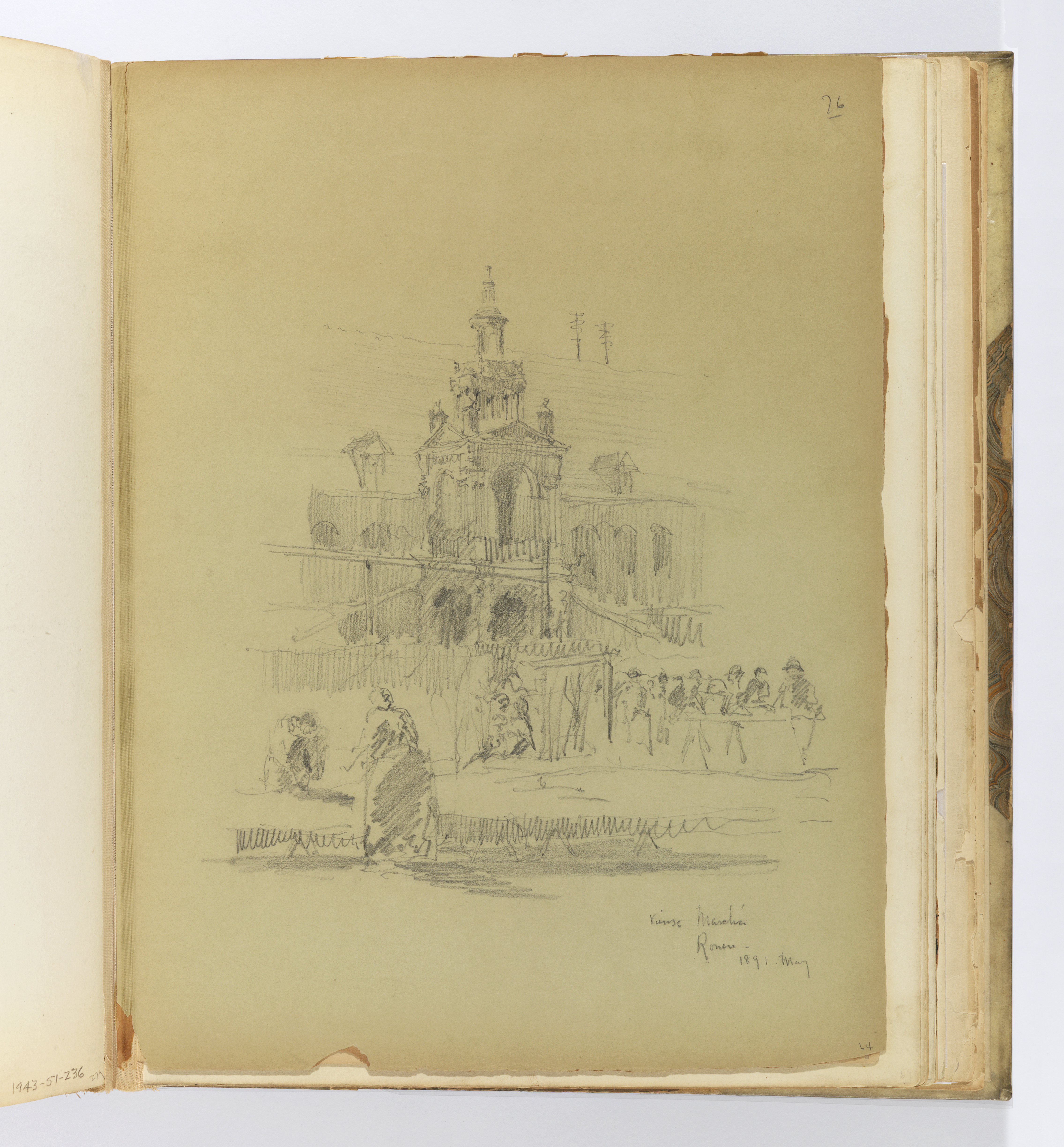 This is a Album page. It was created by Whitney Warren Jr.. It is dated May 1891 and we acquired it in 1943. Its medium is graphite on green paperboard tipped into binding with fabric. It is a part of the Drawings, Prints, and Graphic Design department.