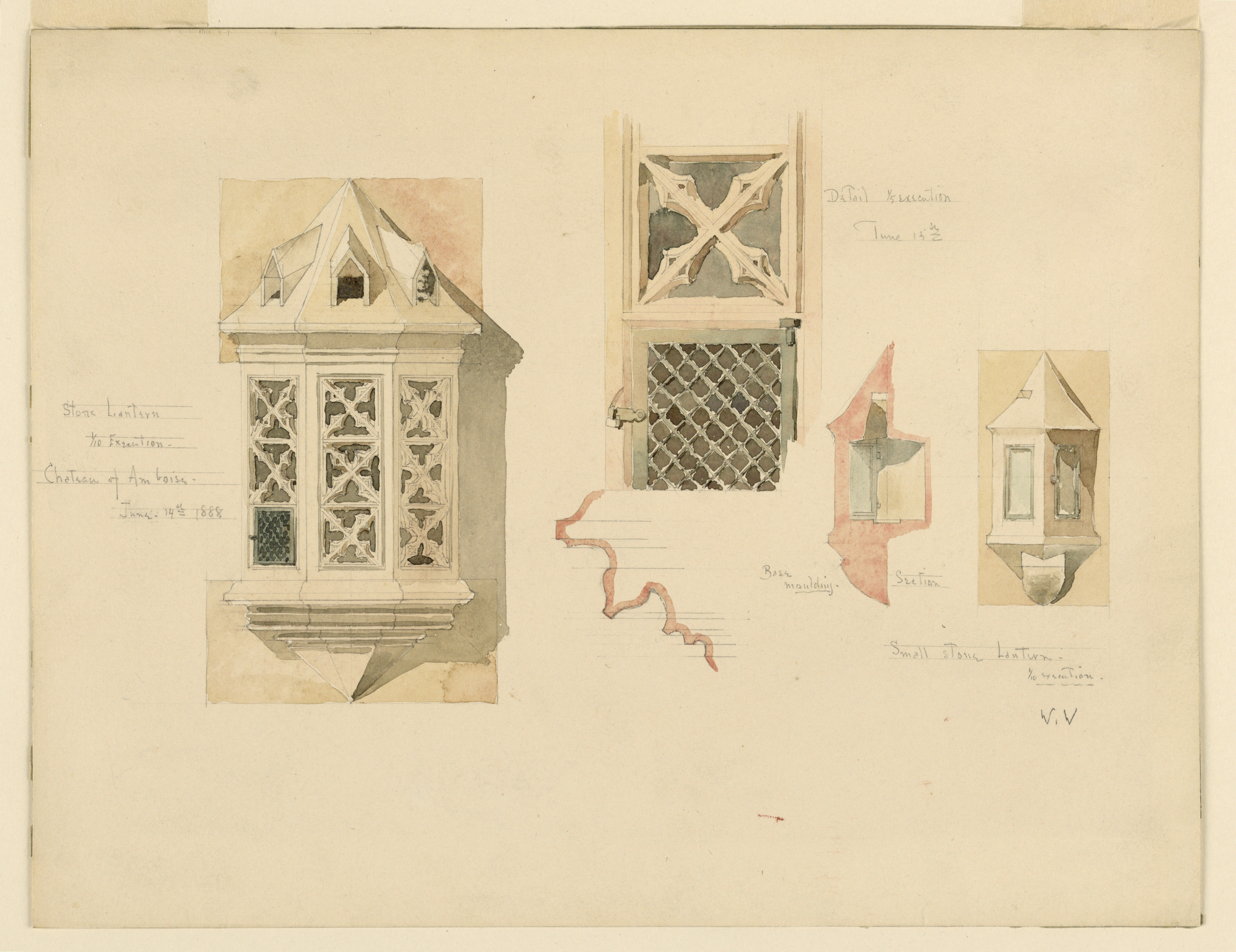 Inscribed in graphite, left: Stone Lantern/ 1/10 exectuion / Chateau of Amboise / June 14th 1888; upper center right: Detail 1/5 execution / June 15th; lower right: Base / moulding.; right: Section; caption: Small stone Lantern / 1/10 execution