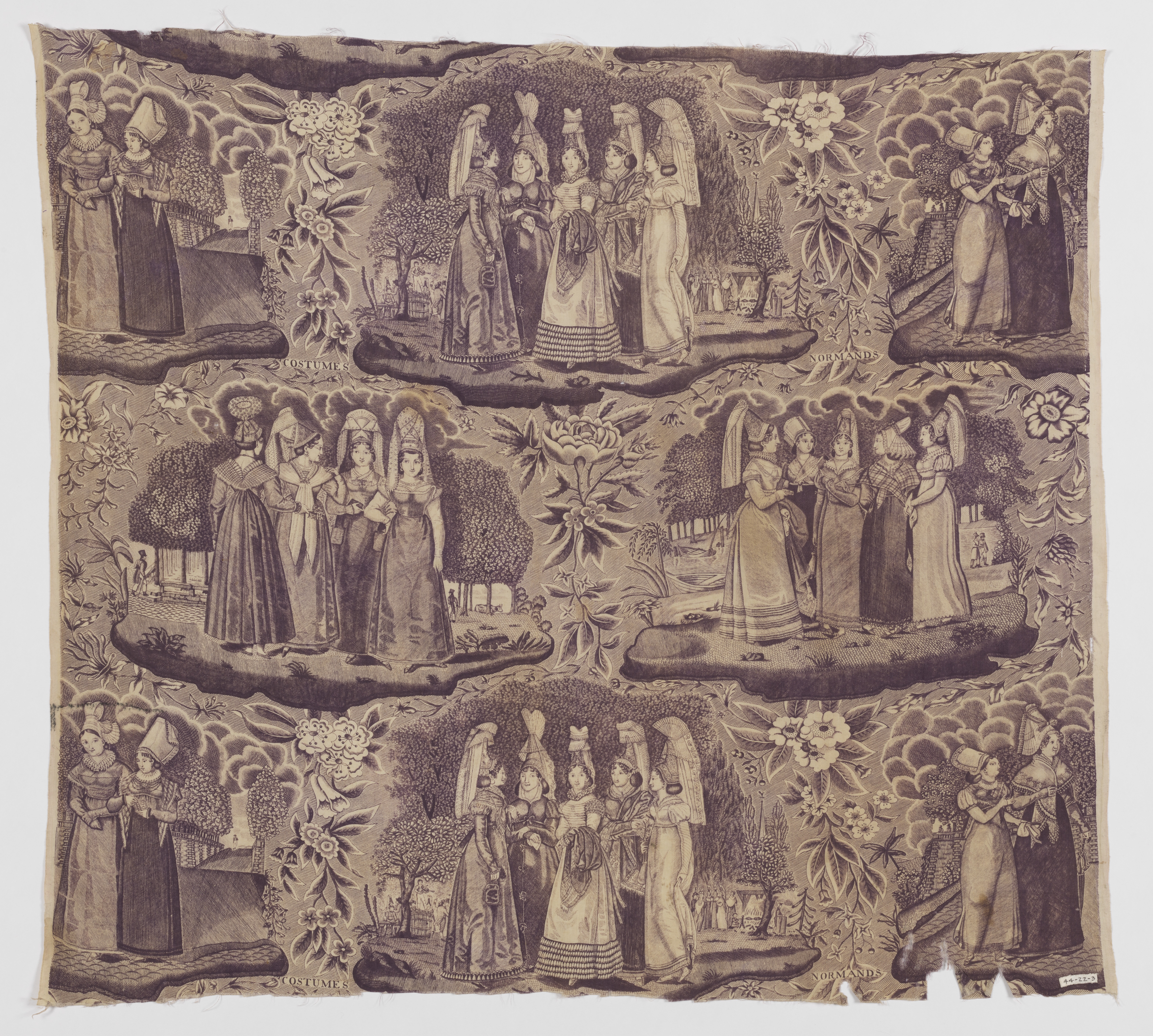 Many of the figures in this cotton from the Cooper Hewitt collection derive from an 1827 publication, Costumes des femmes du pays de Caux et de plusieurs autres parties de l’ancienne province de Normandie, that attests to the growing interest in regional traditional dress during the Romantic period. The 105 individual figures in the plates were drawn by the well-known painter and illustrator, Louis-Marie Lanté (1789-1871), and engraved by Georges-Jacques Gatine (ca. 1773-after 1841). Lanté frequently contributed illustrations to the renowned French fashion periodical Journal des Dames et des Modes (1797-1839), that were also engraved by Gatine. In fact, apart from their distinctive, towering headdresses, the young women’s high-waisted dresses with puffed upper sleeves, applied decoration on the bodice and at the hem, and frilled collars are very similar to contemporary fashion plates. Requiring hours of washing, starching, and ironing, the forms of these elaborate headpieces identified the wearer’s town or village in the Norman province. Among Lanté’s figures selected by the cotton’s designer and placed on small islands in groups of two, four, and five are: Cauchoise (Nos. 1 and 9); Costume de Coutances (No. 26); Costume de Rolleville, dessiné au Hâvre (No. 36); Costume de Rolleville (No. 37); Costume de Lisieux (No. 40); Costume de Caën (No. 43); Jeune fille de Bayeux (Nos. 49 and 52); and Costume de Saint-Valery en Caux (No. 57). The monochromatic palette (here, sepia colored) is characteristic of roller-printed cottons as is the short repeat, disguised by a dense filling pattern of stylized flowers and foliage.