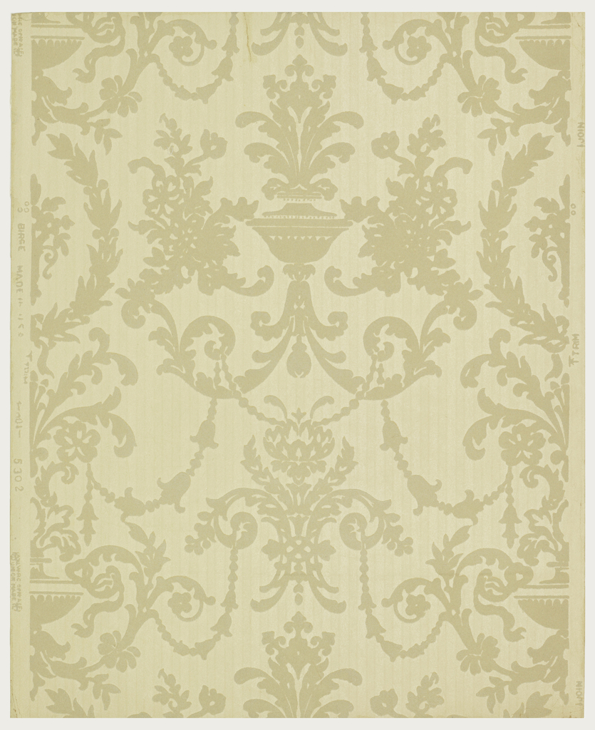 This is a Sidewall. It was manufactured by M.H. Birge & Sons Co.. It is dated 1942 and we acquired it in 1944. Its medium is machine-printed and flocked on embossed paper. It is a part of the Wallcoverings department.