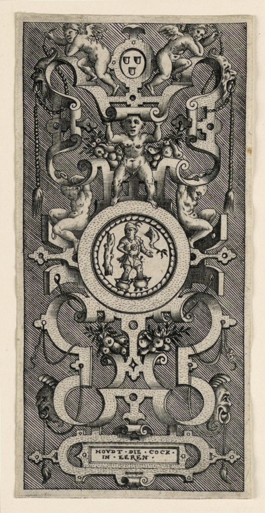 Print, Scrollwork Escutcheon; After Jacob Floris the Elder (Flemish, 1524 - 1581); Netherlands; engraving on paper; 13.7 × 6.7 cm (5 3/8 × 2 5/8 in.); Museum purchase through gift of Mrs. John I. Kane; 1944-83-10
