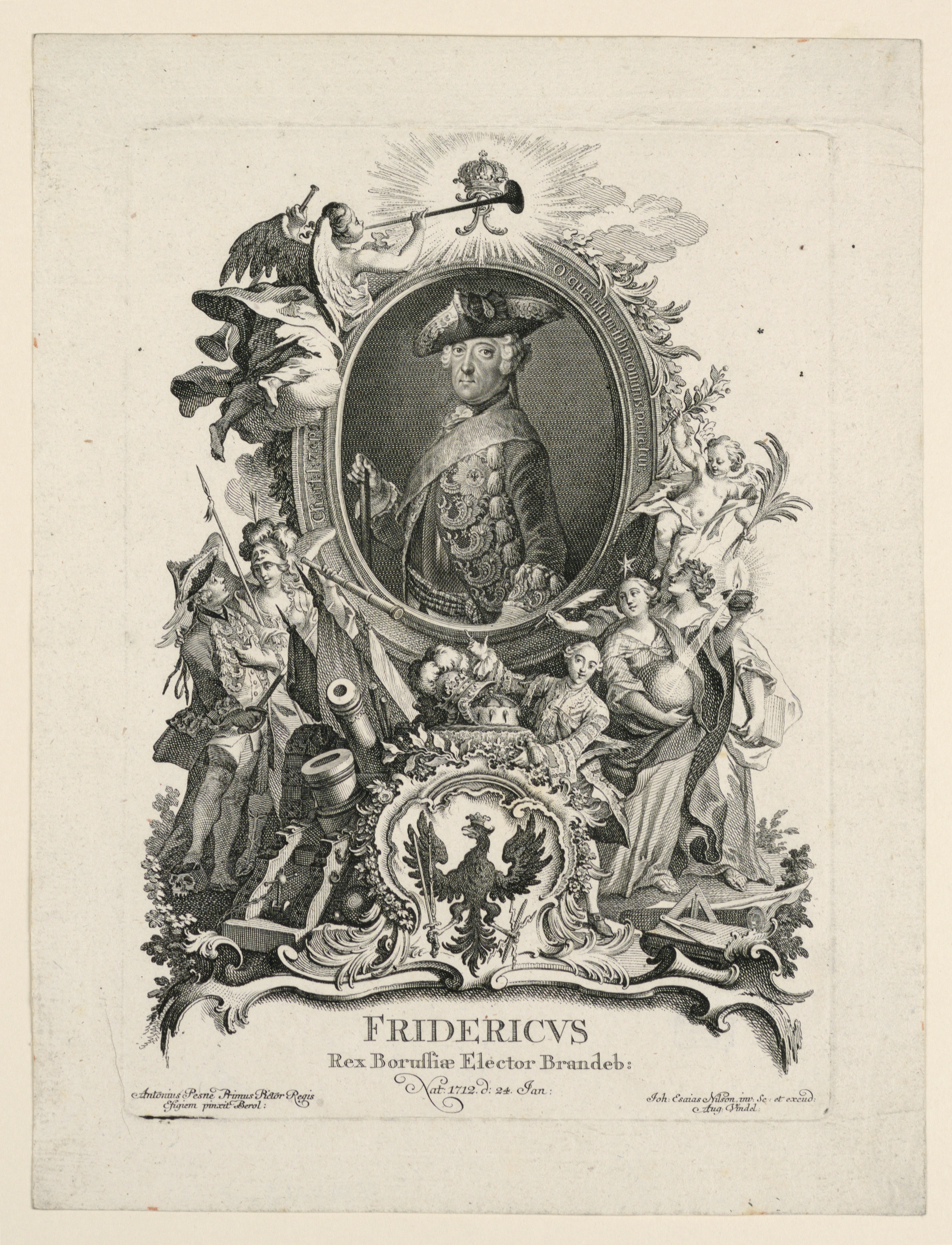 Print, Frederick the Great; After Antoine Pesne; Print Maker: Johann Esais Nilson (German, 1721 – 1783); Germany; etching on paper; 26.5 × 20 cm (10 7/16 × 7 7/8 in.); Museum purchase through gift of Mrs. John I. Kane; 1944-83-11