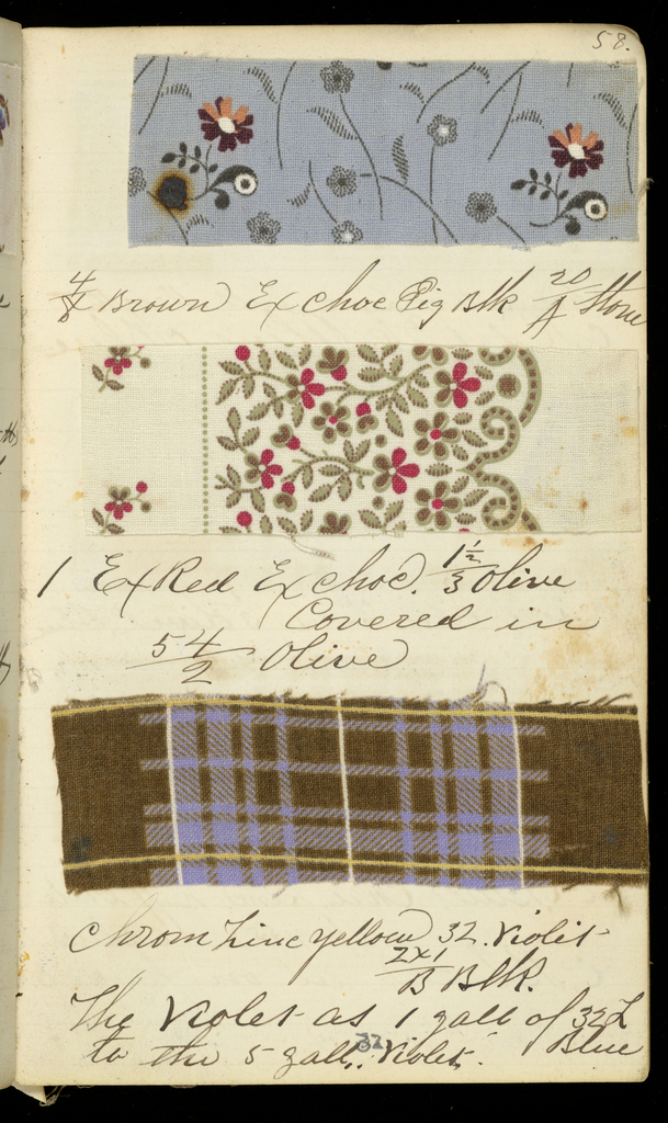 These samples show different colorways for a printed textile probably used as a dress fabric. The book contains information about period design as well as color designations developed in the nineteenth century, such as "Chocolate," "Buff," "Stone," "Wine," and "Drab."