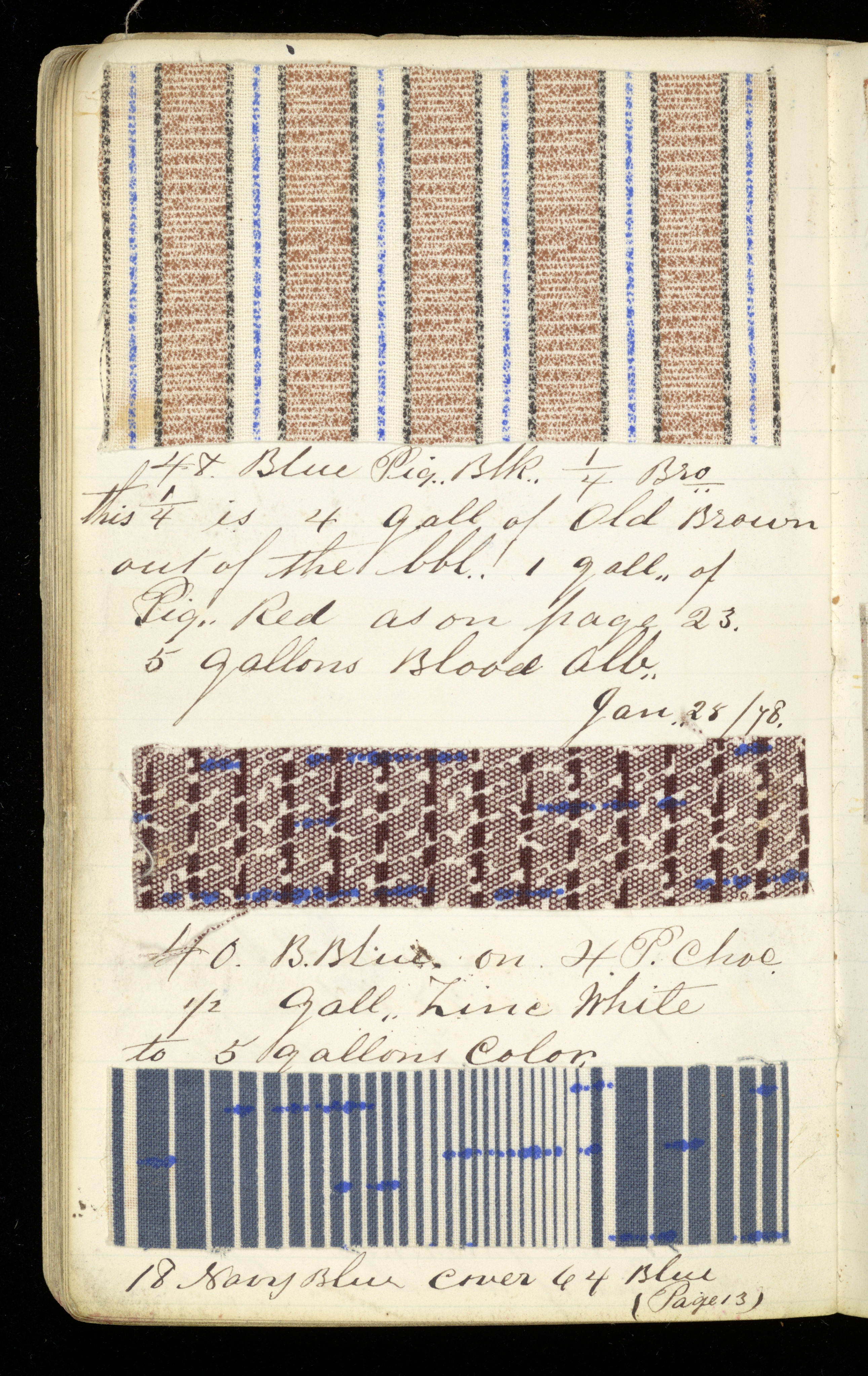 This is a Printer's sample book. It was manufactured by Old Pacific Print Works. It is dated 1877–78 and we acquired it in 1945. Its medium is leather, paper, cotton. It is a part of the Textiles department.