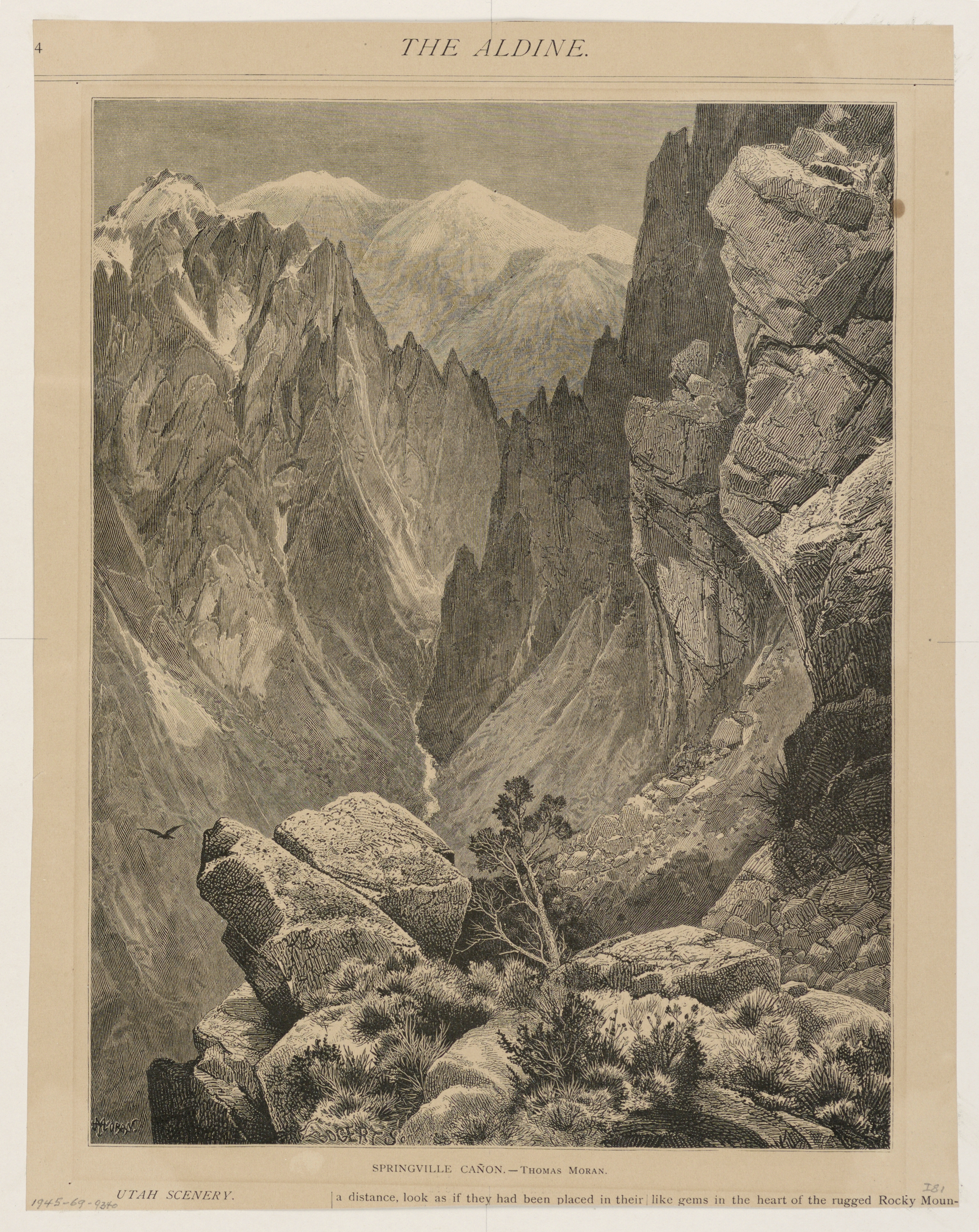 Inscribed in plate, upper margin left: 4; upper margin center: THE ALDINE.; lower margin center: SPRINGVILLE CAÑON—THOMAS MORAN.