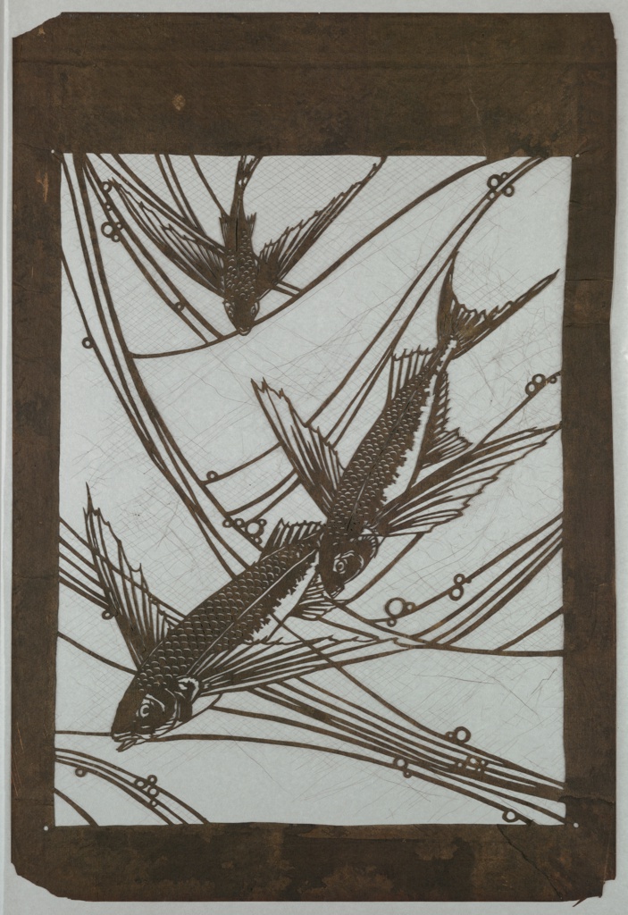 Katagami, Flying Fish; Japan; mulberry paper (kozo washi) treated with fermented persimmon juice (kakishibu), silk threads (itoire); 64.3 × 43.9 cm (25 5/16 × 17 5/16 in.); Museum purchase through gift of Norvin Hewitt Green; 1946-104-8