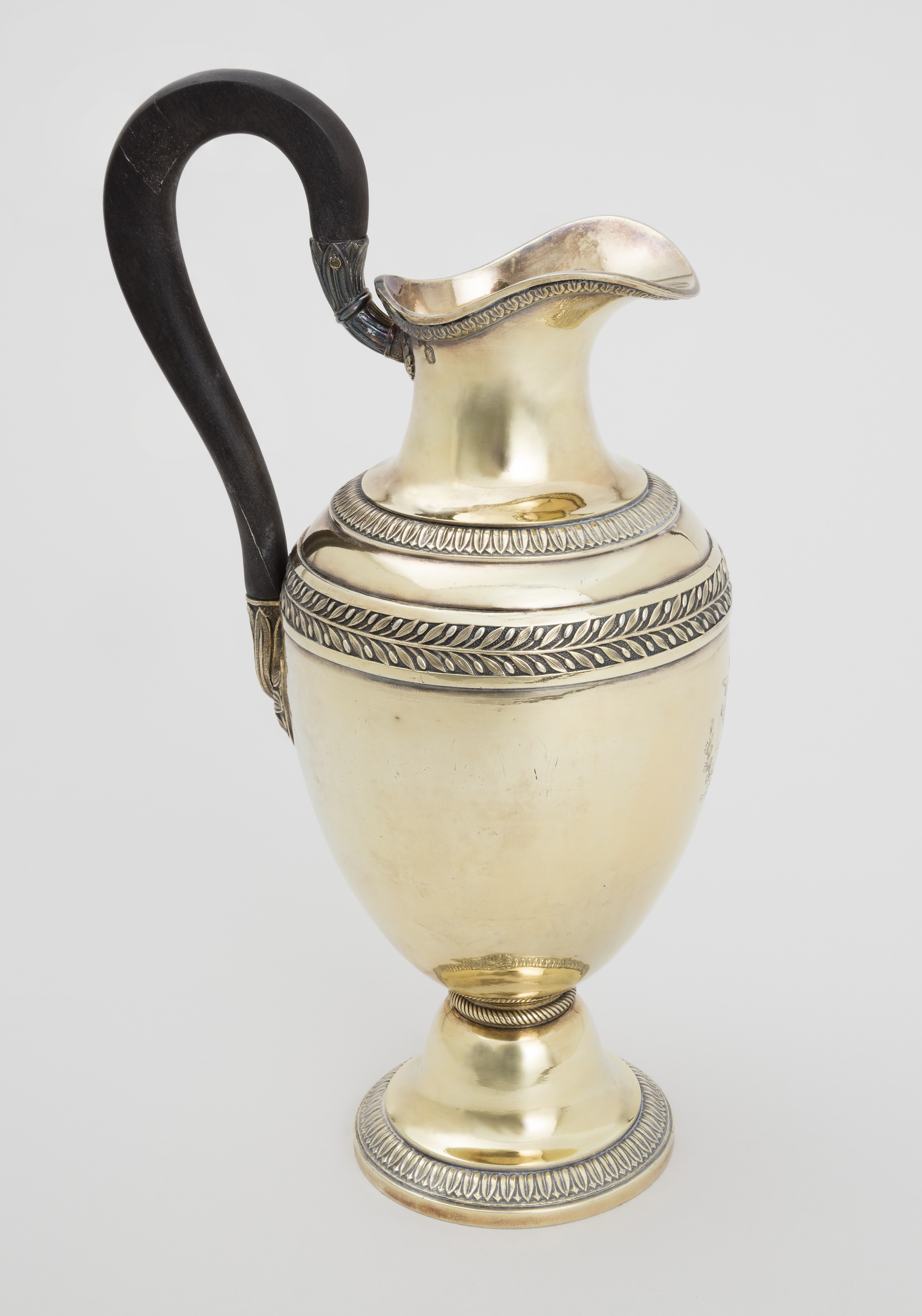 On the underside of jug: [1] “O” above a lamp within a lozenge, impressed (maker’s mark) On the base edge of jug: [1] “ODIOT.”, impressed (maker’s mark) [2] Cérès head in circle, impressed (guarantee mark, French, 1819–1838) On the neck of jug, near the handle: [1] Michelangelo head facing right with “1” in an octagon, impressed (standard mark, French, 1819–1838)