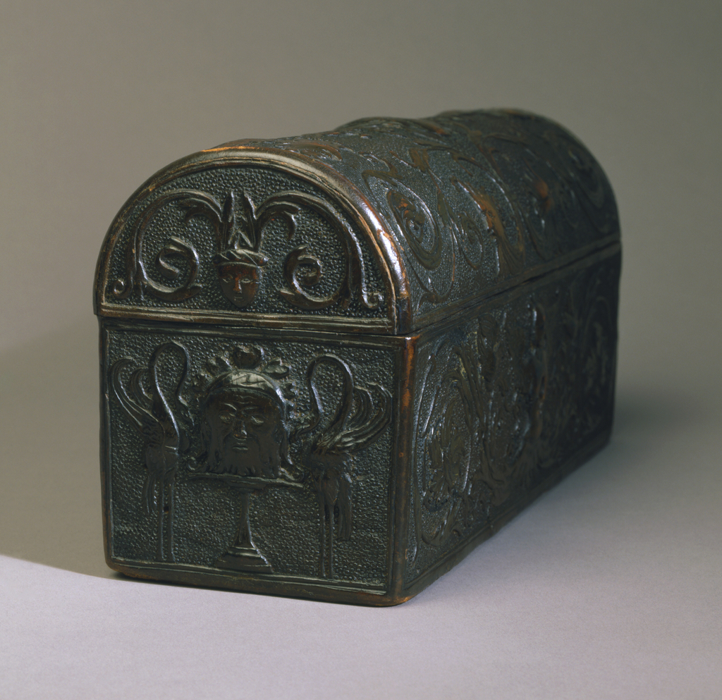This is a Casket. It is dated first half 16th century and we acquired it in 1947. Its medium is tooled leather over wood, metal, silk (interior). It is a part of the Product Design and Decorative Arts department.