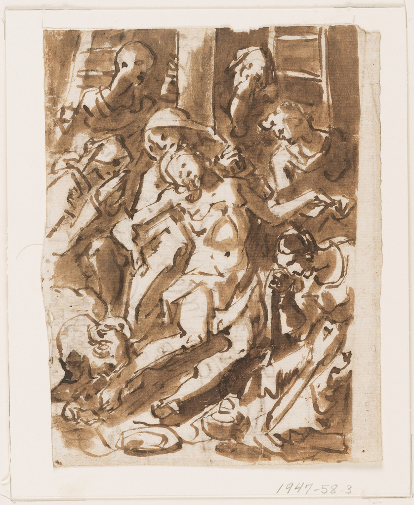 Drawing, Lamentation over the Dead Christ; Jan van der Straet, called Stradanus (Flemish, 1523–1605); Netherlands; recto: pen and brown ink, brush and brown wash over black chalk on laid paper verso: pen and brown ink over black chalk on laid paper; H x W: 13.9 × 10.8 cm (5 1/2 × 4 1/4 in.); Gift of Janos Scholz; 1947-58-3