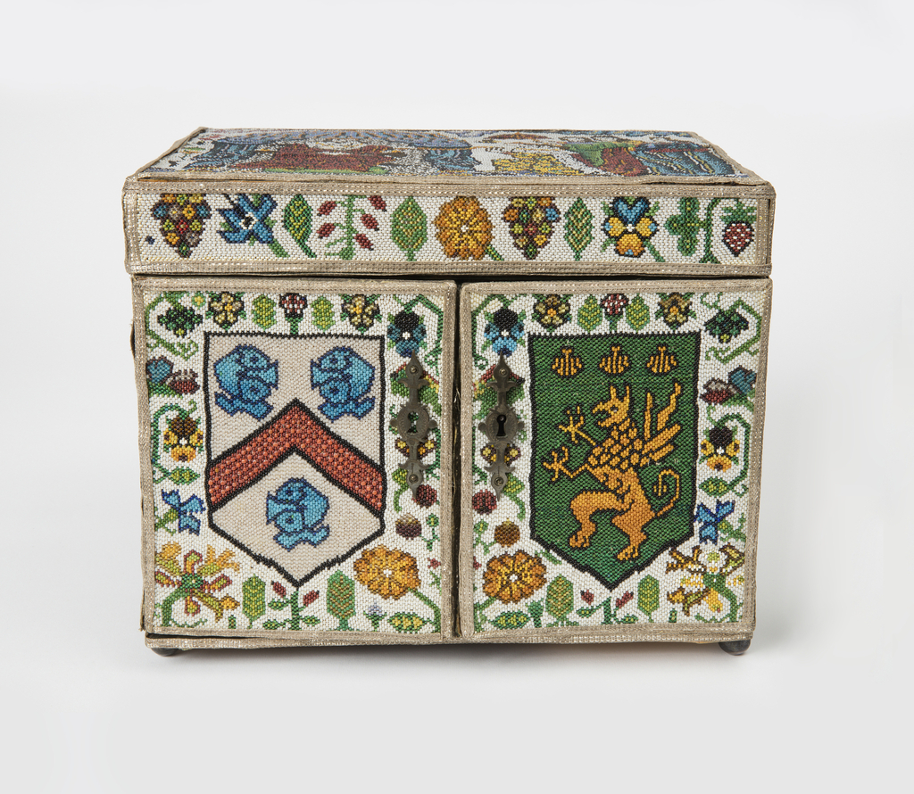 This is a Casket. It was made by Frances Basnet. It is dated 1654 and we acquired it in 1947. Its medium is wood, silk, glass beads and its technique is wooden casket covered with satin fabric and embroidered with glass beads. It is a part of the Textiles department.