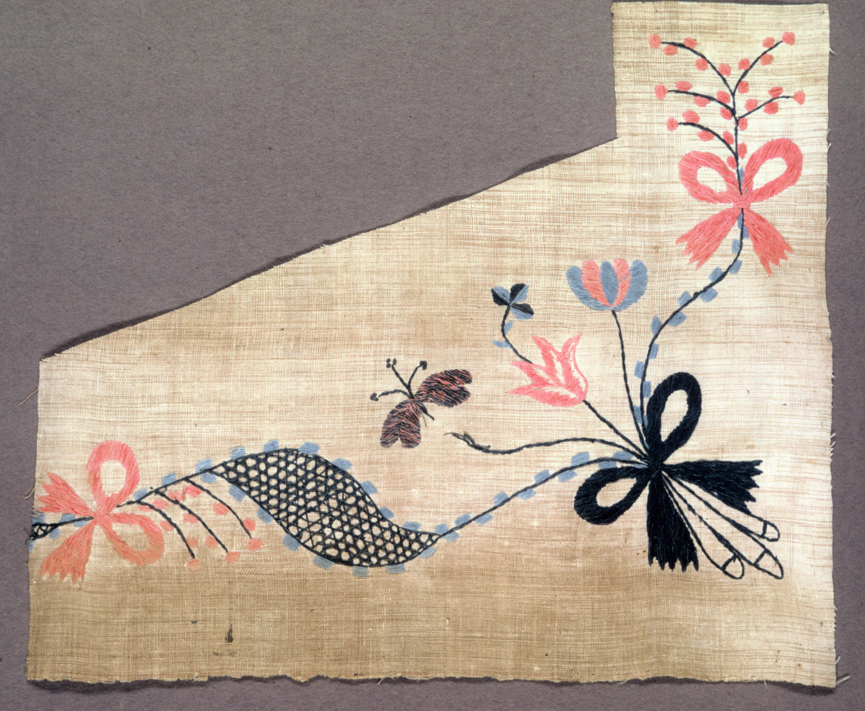 This is a Fragment. It is dated 19th century and we acquired it in 1947. Its medium is cotton on bast fiber and its technique is embroidered. It is a part of the Textiles department.