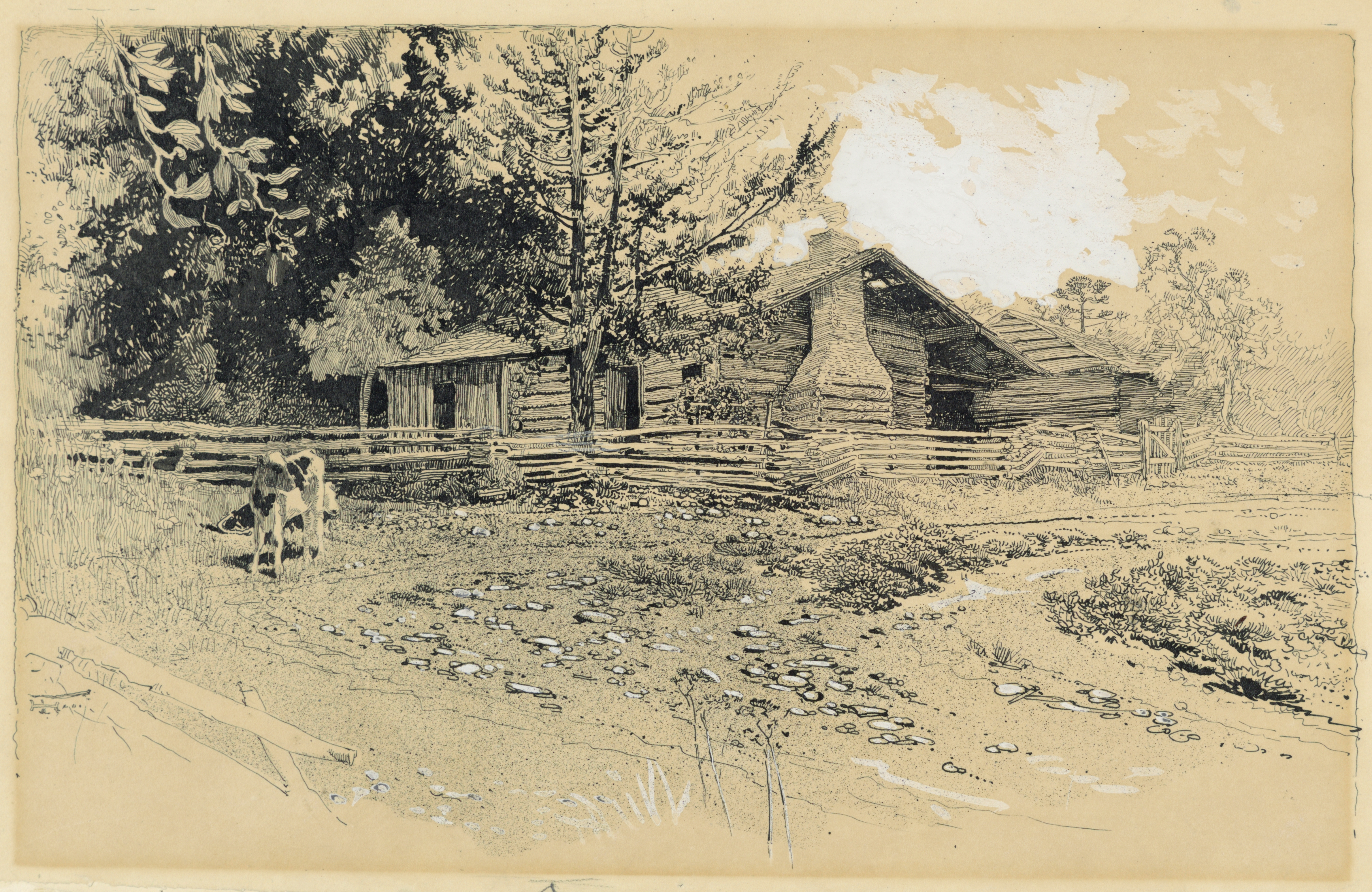 Drawing, The Snodgrass Farmhouse, Chickamauga; Harry Fenn (American, 1845–1911); USA; pen and ink, with white gouache, on paper; 19 × 29.9 cm (7 1/2 × 11 3/4 in.); Gift of Willis M. Rose; 1947-87-7
