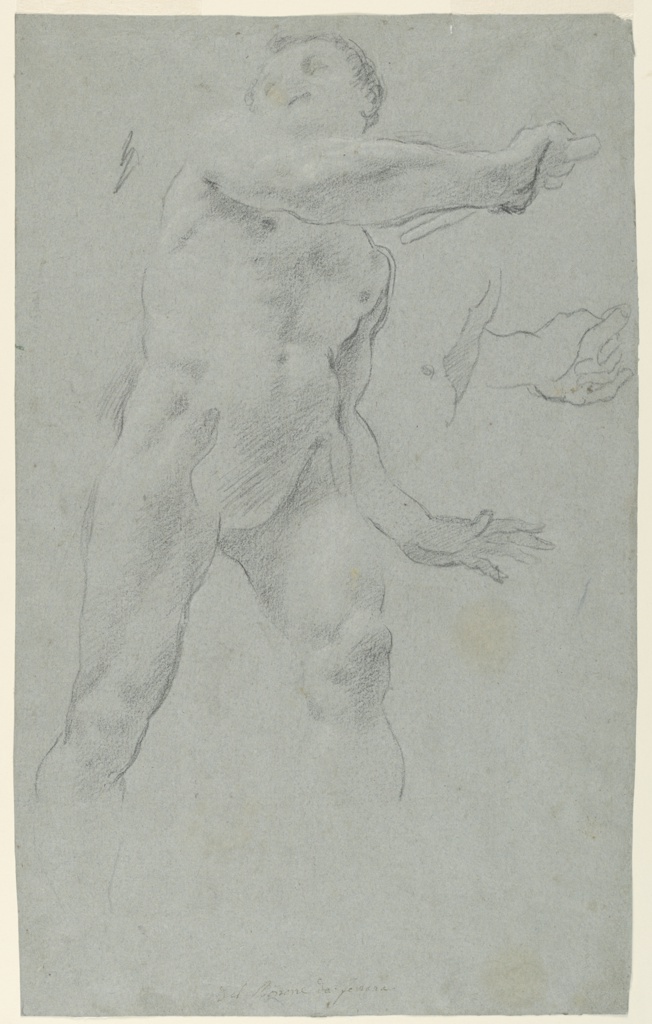Drawing, Male Nude; Carlo Bononi (Italian, 1569–1632); Italy; black chalk on grey laid paper; 42.4 × 26.2 cm (16 11/16 × 10 5/16 in.); Gift of Mrs. Grafton H. Pyne; 1948-118-42