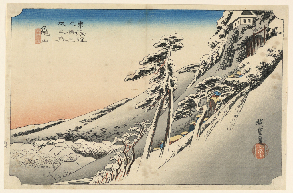 Print, Kameyama, Snow Scene, in The Fifty-Three Stations of the Tokaido Road (Tokaido Gojusan Tsugi-no Uchi)