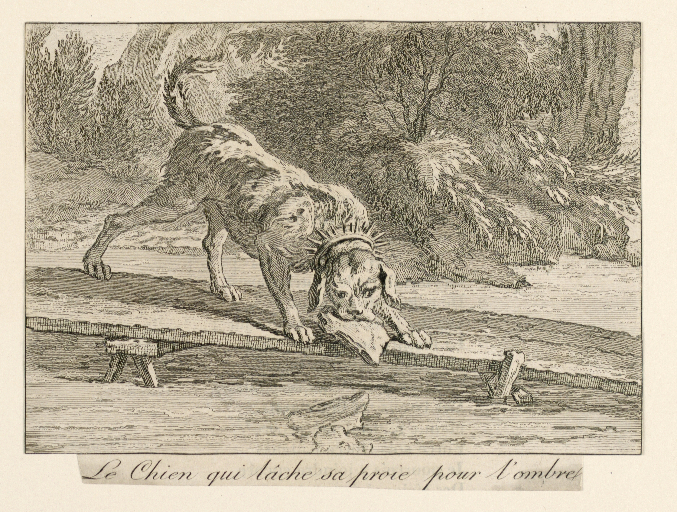 Engraving, "Le chien qui lache sa proie pour l'ombre" from La Fontaine's Fables