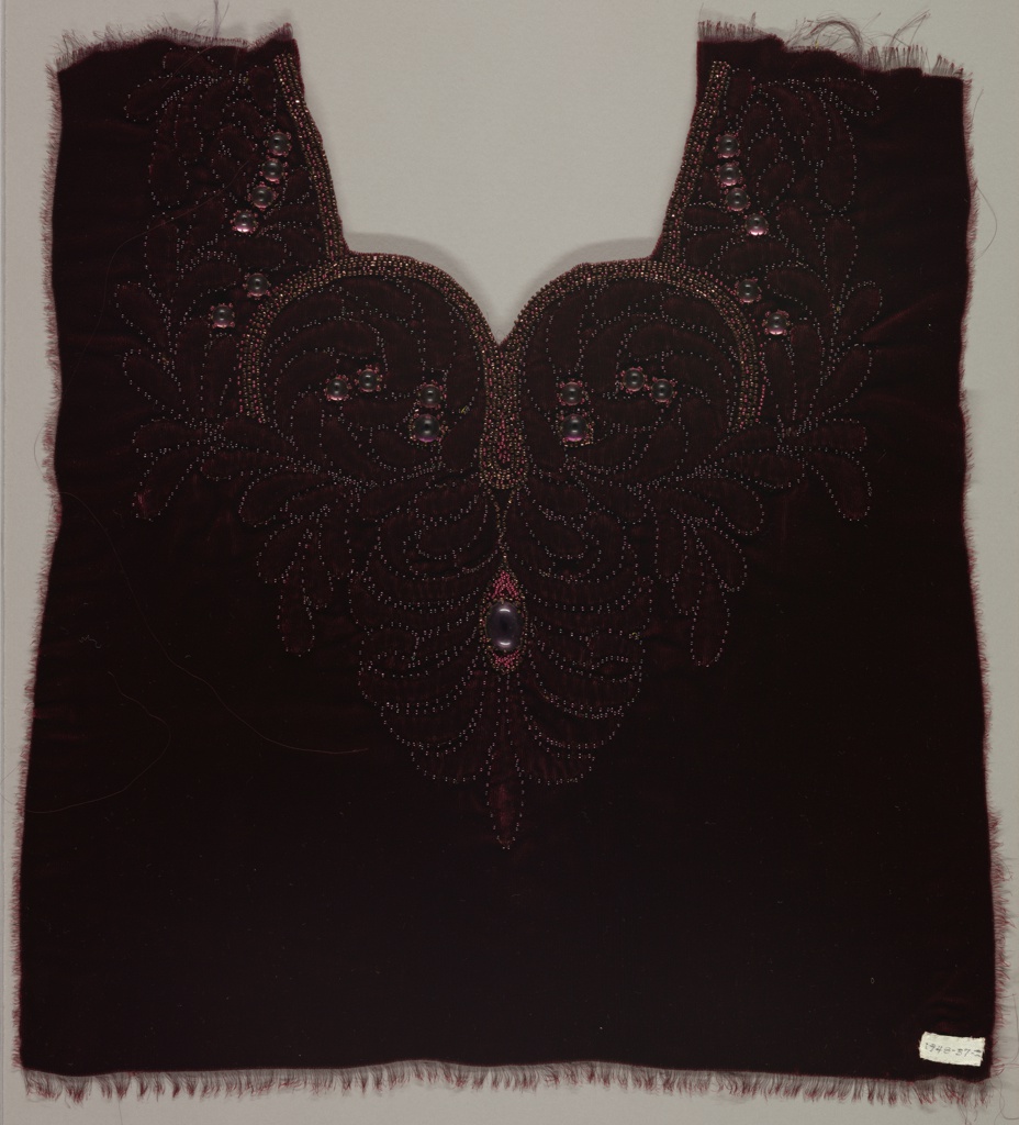 This is a Embroidery sample. It was made by Madame Sabo, Inc. (New York, NY, USA). It is dated 1948 and we acquired it in 1948. Its medium is velvet (fiber?), glass beads and its technique is bead embroidery on velvet. It is a part of the Textiles department.