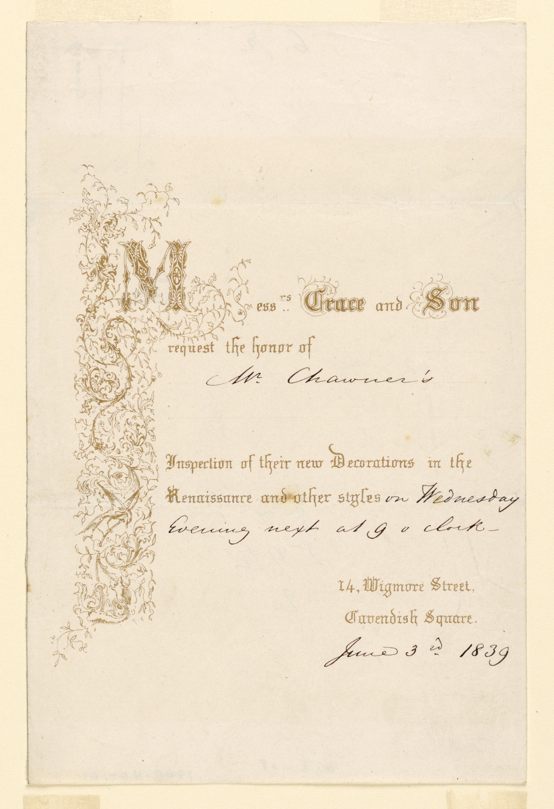 Inscribed on plate, center: Messrs Crace and Son / request the honor of / Inspection of their new Decorations in the / Renaissance and other styles / 14 Wigmore Street / Cavendish Square. Inscribed in pen and black ink, center: Mr. Chawner’s / on Wednesday / Evening next at 9 o’clock / June 3rd 1839.