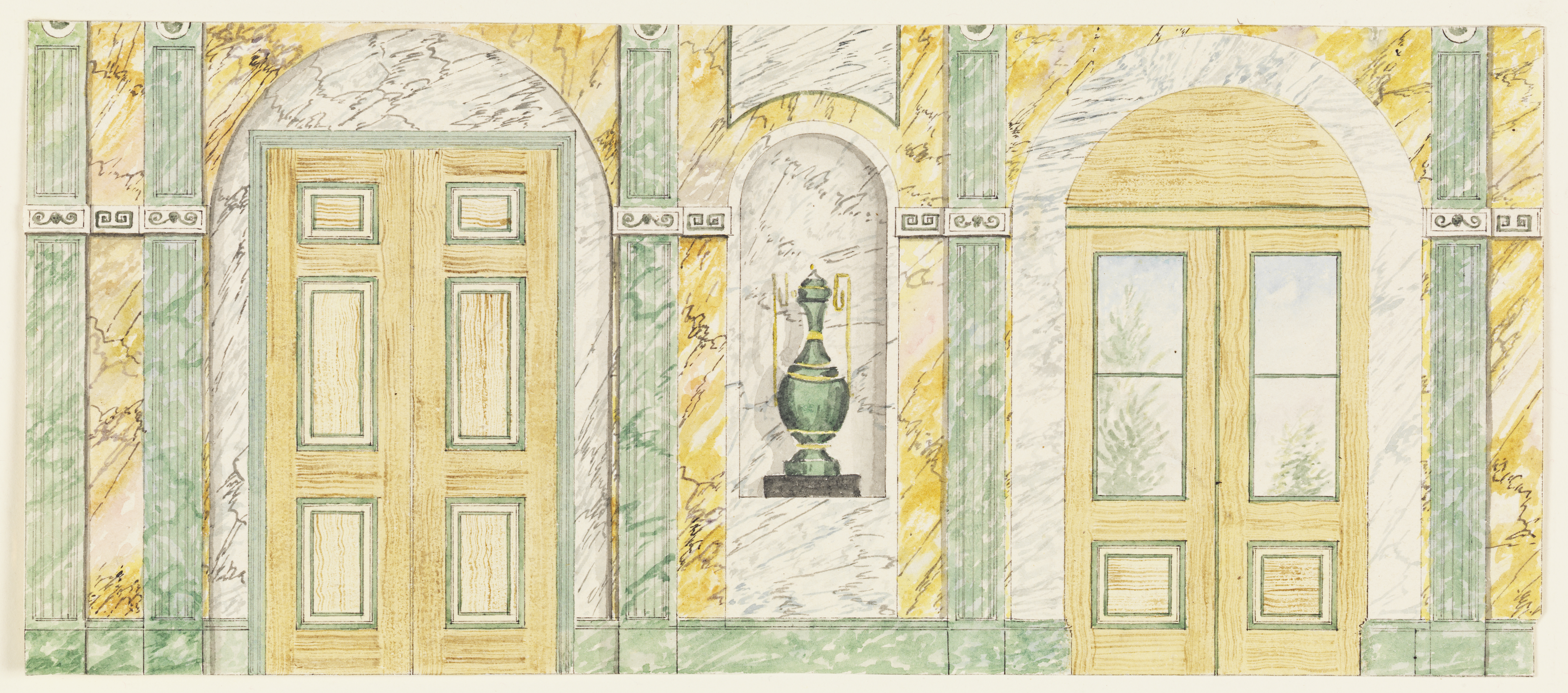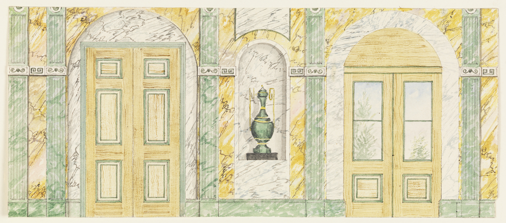 Drawing, Wall Elevation; England; pen, black ink, green, yelow and gray wash on wove paper; H x W: 10.5 x 24.3 cm (4 1/8 x 9 9/16 in.); Museum purchase through gift of Mrs. John Innes Kane; 1948-40-115