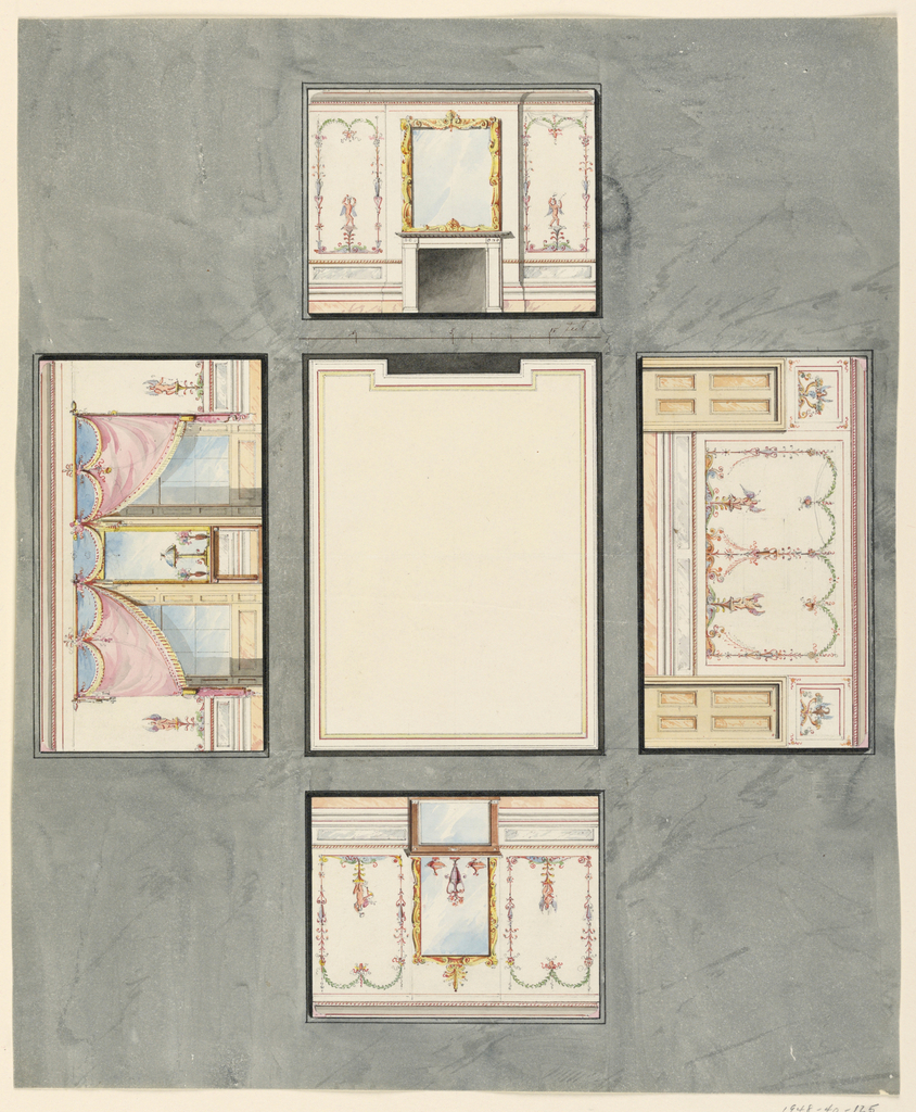 Drawing, Ceiling and Four Walls of a Room; Designed by Frederick Crace (English, 1779–1859); England; graphite, pen and black ink, brush and watercolor on wove paper; 35 x 28.8 cm (13 3/4 x 11 5/16 in.); Museum purchase through gift of Mrs. John Innes Kane; 1948-40-125