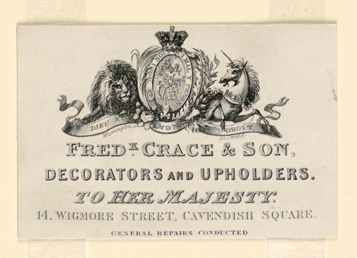 Inscribed on plate, center: the inscription: Fredk Crace and Son,/ Decorators and Upholders/ To Her Majesty./ 14 Wigmore Street, Cavendish Square...