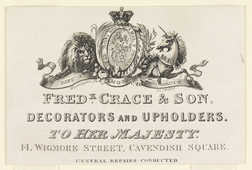 Inscribed on plate, center: the inscription: Fredk Crace and Son,/ Decorators and Upholders/ To Her Majesty./ 14 Wigmore Street, Cavendish Square...