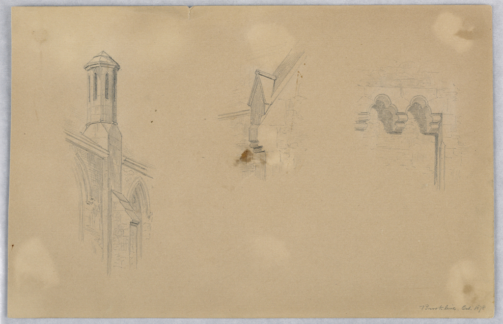 Drawing, Architectural Details from Church in Brookline; Arnold William Brunner (American, 1857–1925); USA; graphite on light brown paper; 17.4 × 26.9 cm (6 7/8 × 10 9/16 in.); Gift of Mrs. Arnold W. Brunner; 1948-47-269