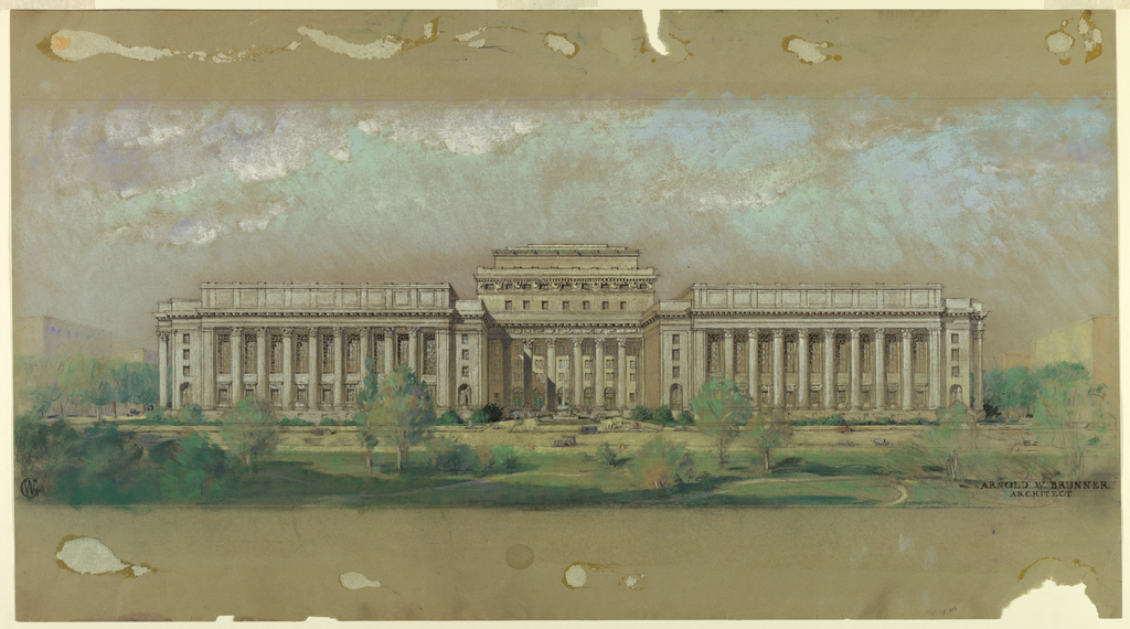 Drawing, Proposal for Public Building; Architect: Arnold William Brunner (American, 1857–1925); USA; brush and watercolor, pastel, graphite on gray-brown paper; 46.3 x 84 cm (18 1/4 x 33 1/16 in.); Gift of Mrs. Arnold W. Brunner; 1948-47-359