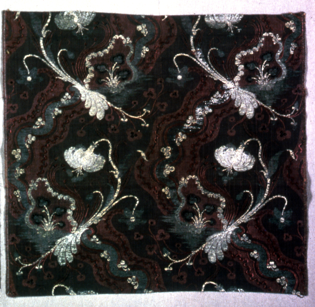 This is a Textile. It is dated 18th century and we acquired it in 1949. Its medium is silk, metallic threads and its technique is compound weave with discontinuous supplementary weft patterning (brocade). It is a part of the Textiles department.