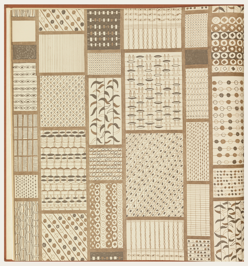 This is a Sample book. It was designed by Ilonka Karasz, William Justema, Marion Dorn Kauffer and Lanette Scheeline and made by Katzenbach and Warren, Inc.. It is dated 1956 and we acquired it in 1980. Its medium is intaglio-printed paper; plastic coated. It is a part of the Wallcoverings department.